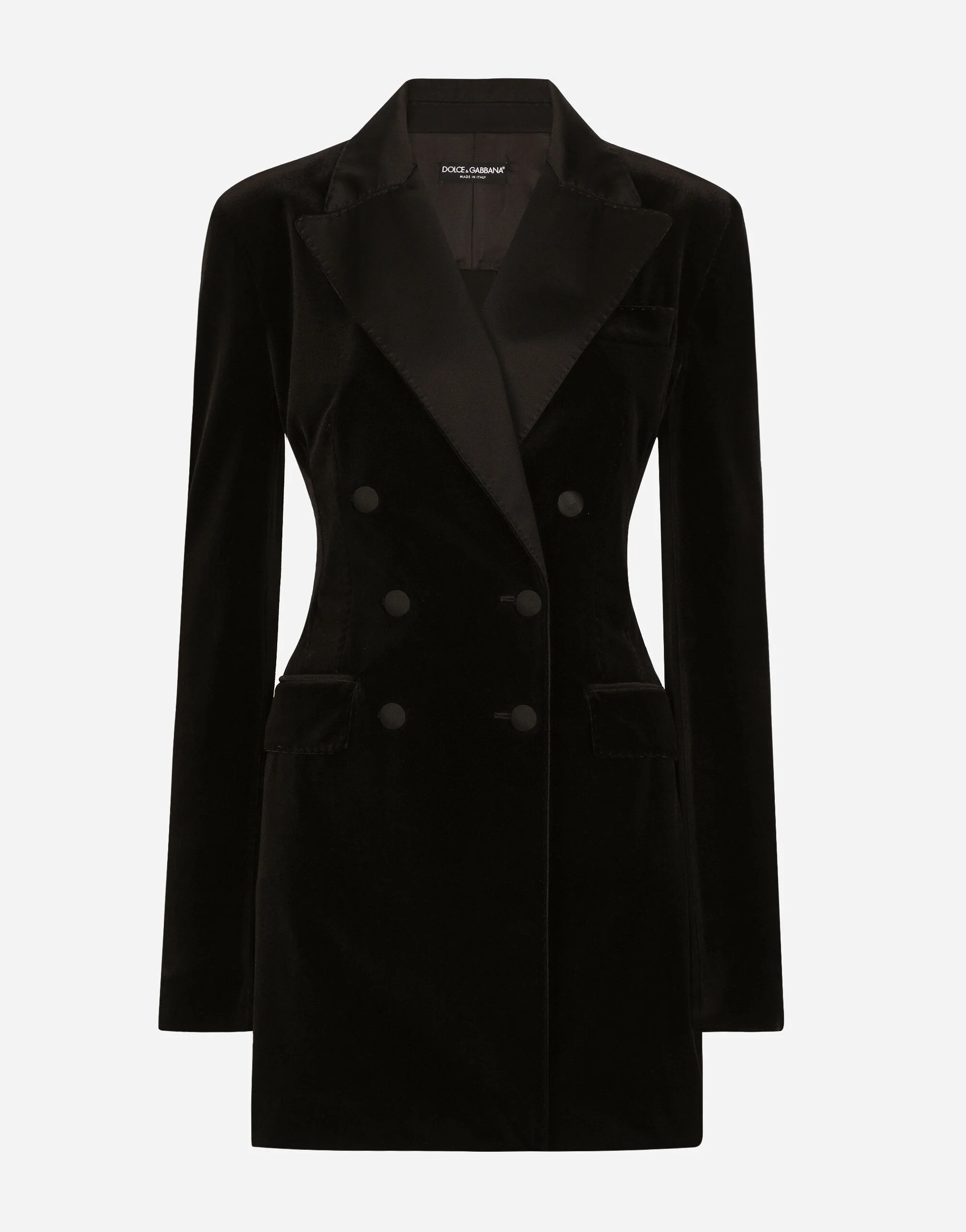 In the Black Sicily Collection, black, the absolute protagonist, becomes sensual black, sheer black, Dolce&Gabbana black. The key concept is “Black on Black”. Playing around with proportions, volumes, layered fabrics and sheer details, this style becomes absolute, bold and sexy. Unique and unmistakable, it is conveyed through the contrasts between glossy and matte fabrics, lines, volumes and special details, thereby expressing a woman’s various personalities and the true identity of Dolce&Gabbana. Double-breasted stretch velvet Turlington jacket: • Black • Satin peak lapels • Long sleeves • Welt pockets with flaps • Stretch silk satin lining on the yoke, under flaps and pockets • Unlined • Satin-covered button fastenings • The piece measures 80 cm from the center back on a size IT 40 • The model is 175 cm tall and wears a size IT 40 • Made in Italy External composition: 73% Polyester 21% Silk 6% Spandex Internal composition: 92% Silk 8% Spandex
