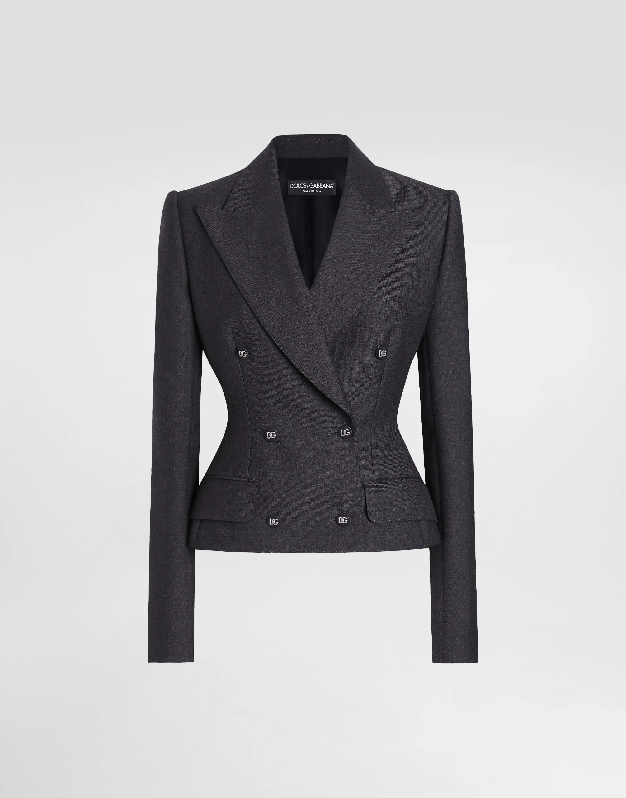 The Everyday Women's Collection reimagines contemporary daily wear with Dolce&Gabbana's signature style codes. Iconic fabrics mix with standout details like embroidered flowers, crystals, and jewel buttons, infusing elegance into every look. Gray animal print accented with green and purple, hyper-geometric jewelry, voluminous shapes and transparencies add unique touches. Men's tweed is reinvented with graphic twists, creating distinctive pieces that reflect refined sensuality. Double-breasted Dolce jacket with DG-branded buttons: • Gray • Peak lapels • Long sleeves • Faux welt pockets • Slightly wad-padded sides • Silk satin lining • DG-branded button fastenings • The piece measures 56 cm from the center back on a size IT 40 • The model is 175 cm tall and wears a size IT 40 • Made in Italy External composition: 100% Virgin Wool Internal composition: 100% Silk