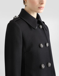 The Women's Black Sicily Collection reinforces Dolce&Gabbana's iconic fabrics and codes rooted in Italian heritage. Sensual silhouettes, highlighted by floral prints and refined corsetry, evoke an intriguing elegance, while the iconic black lace, satin, and velvet dominate the collection. Denim in various shades of blue introduces a contemporary twist, balancing the classic and modern. Embroidered crosses, medals, and jewelry add a sophisticated touch. Double-breasted stretch wool coat with bejeweled buttons: • Black • Baby collar • Long sleeves • Welt pockets • Stretch silk satin lining • Cannete-covered button fastenings and DG logo • The piece measures 121 cm from the center back on a size IT 40 • The model is 175 cm tall and wears a size IT 40 • Made in Italy External composition: 98% Virgin Wool 02% Spandex Internal composition: 92% Silk 08% Spandex