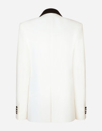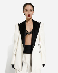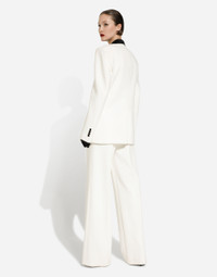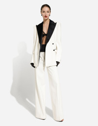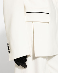 Double-breasted double wool crepe jacket with tuxedo lapels: • White • Contrasting duchesse peak lapels • Long sleeves • Flap pockets with contrasting piping • Silk satin lining • Concealed button fastenings • The piece measures 75 cm from the center back on a size IT 40 • The model is 175 cm tall and wears a size IT 40 • Made in Italy Care And Details External composition: 76% Viscose 17% Silk 5% Polyester 2% Spandex Internal composition: 100% Silk