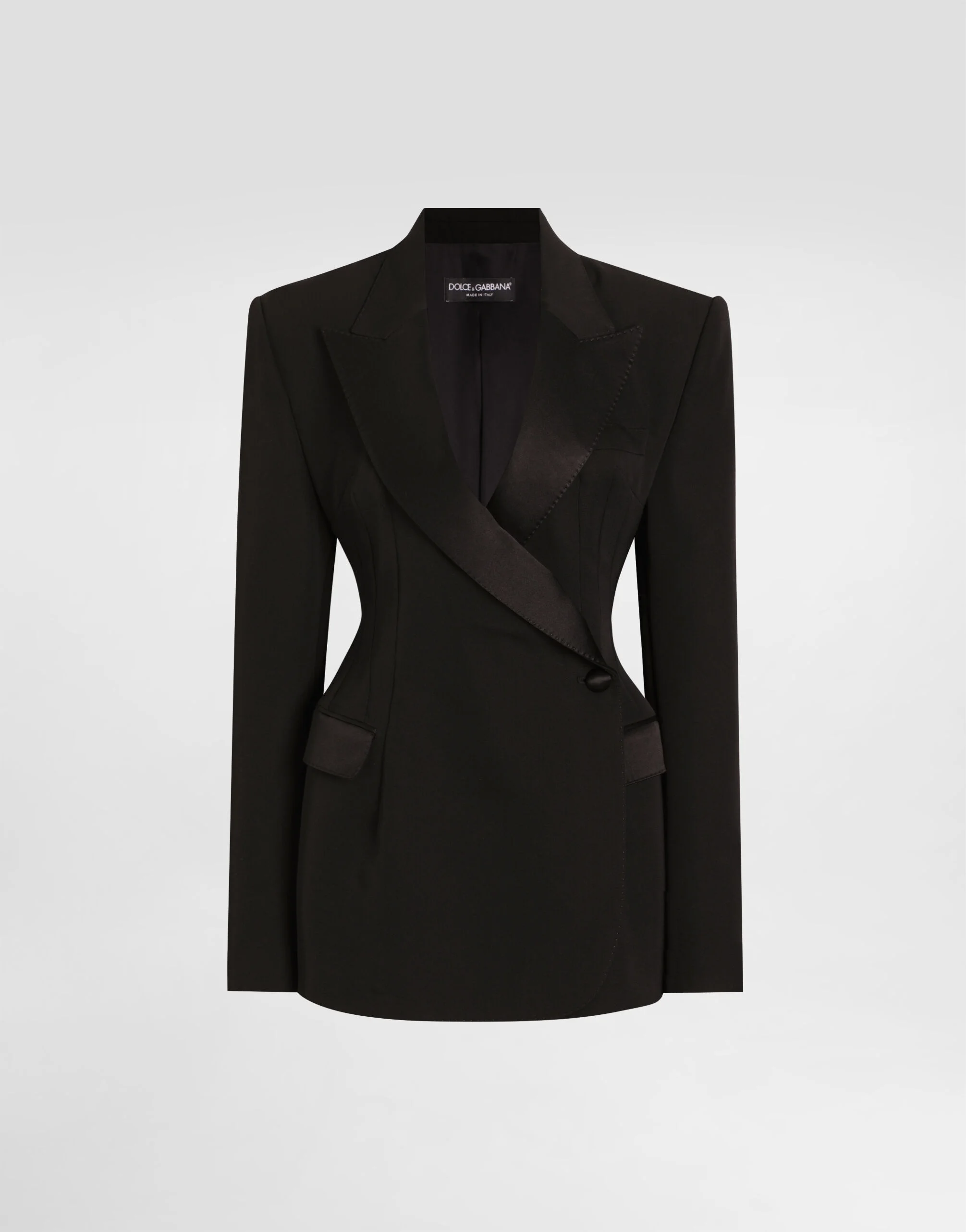 The Spring/Summer 2025 Women’s Collection is celebrating Italian beauty through bold and charismatic femininity. The 50s-inspired lingerie is the star, intermingling with fitted dresses, corsets and oversize trench coats. The iconic jackets have been updated with cropped cuts and modern inserts, while the floral prints add a romantic edge. The eveningwear shines with light fabrics and crystals, accompanied by look-defining accessories, from iconic bags to the cross earrings. Double-breasted wool gabardine tuxedo jacket: • Black • Peak lapels • Long sleeves • Flap pockets • Stretch silk satin lining • Button fastenings • The piece measures 75 cm from the center back on a size IT 40 • The model is 175 cm tall and wears a size IT 40 • Made in Italy External composition: 79% Virgin Wool 16% Silk 05% Polyester Internal composition: 94% Silk 06% Spandex