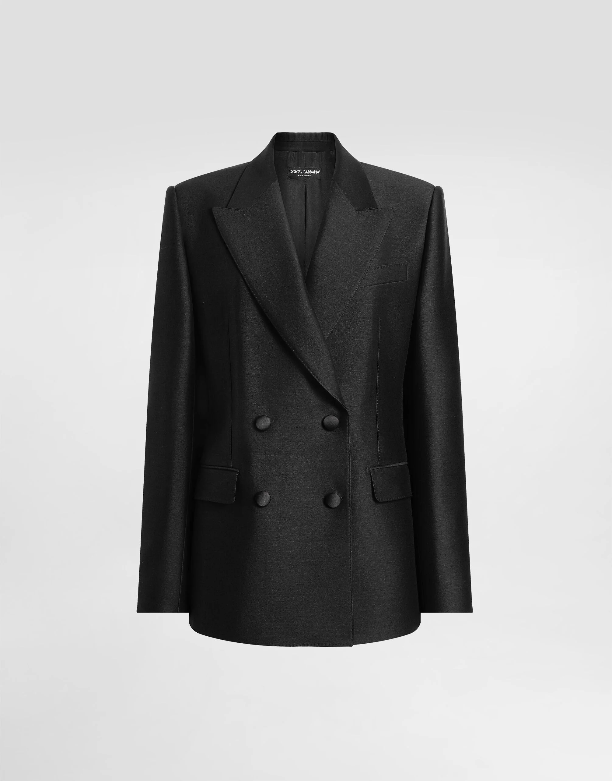 This elegant double-breasted jacket is an example of sophisticated Italian Tailoring, perfect for adding a touch of class to any modern woman's wardrobe. Double-breasted jacket in heavy faille: • Black • Peak lapels • 4 buttons • Central slit • Semi-structured and lined • The model is 175 cm tall and wears size 40 IT • Made in Italy External Composition: 86% Virgin Wool, 14% Silk Internal Composition: 92% Silk, 8% Elastane