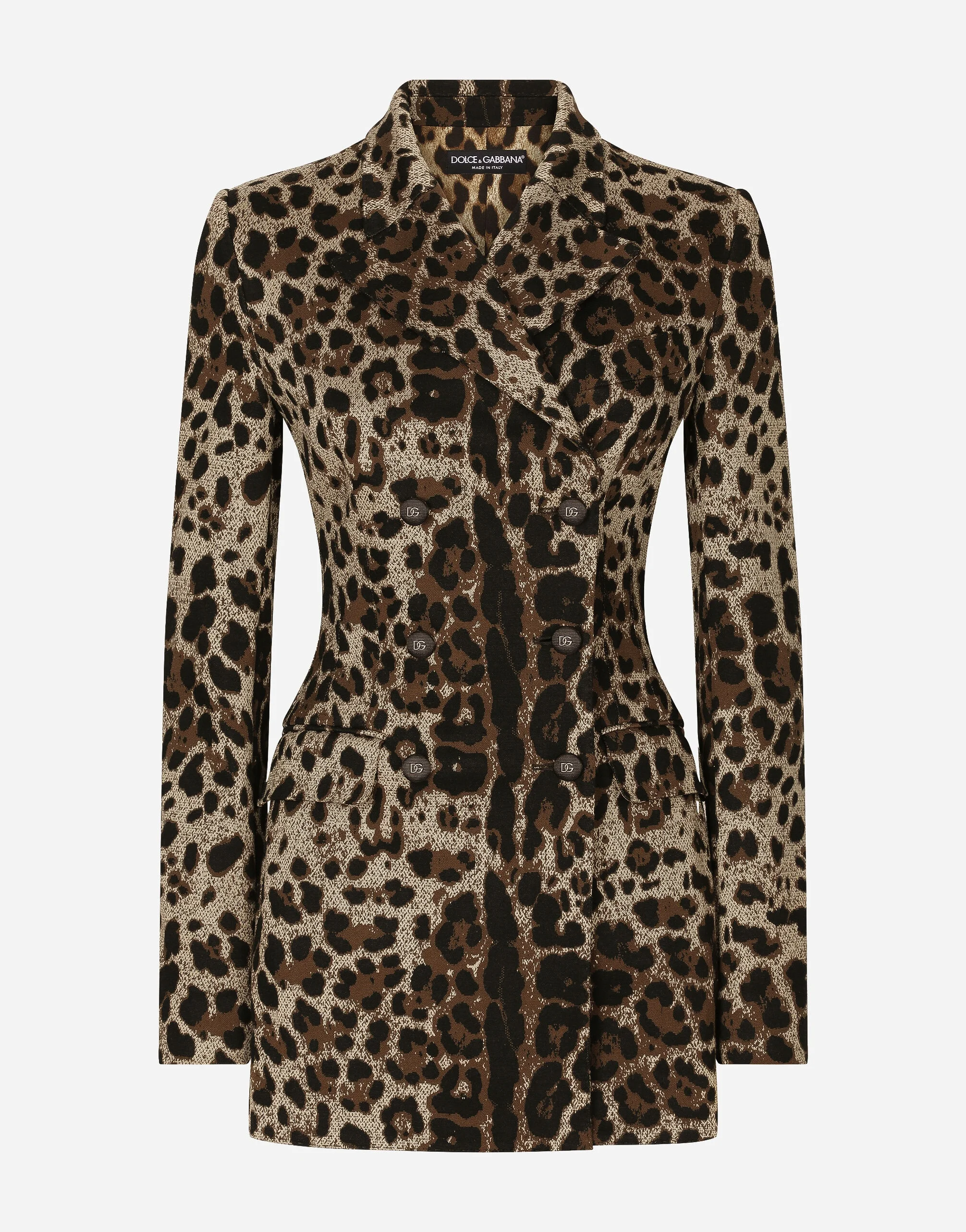 Double-breasted Turlington jacket in leopard-design stretch wool jacquard: • Animal print • Peak lapels • Long sleeves • Flap pockets • Partially lined on the yoke • Canneté-covered button fastenings and DG logo • The piece measures 75 cm from the rear collar seam on a size IT 40 • The model is 175 cm tall and wears a size IT 40 • Made in Italy The difference in the print placement that you may find on this product is a feature of Dolce&Gabbana’s “Handmade” pieces. A detail that makes every garment or accessory unique and exclusive. Care And Details External composition: 55% Viscose 42% Polyamide 3% Spandex Internal composition: 100% Polyester