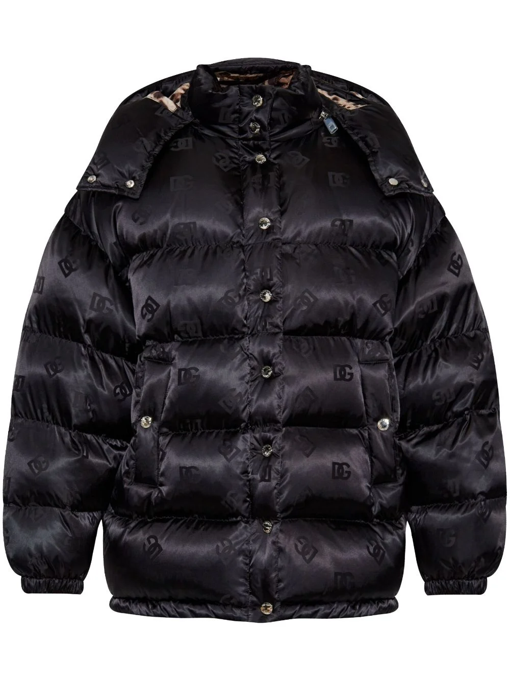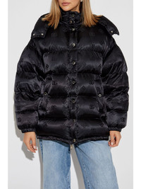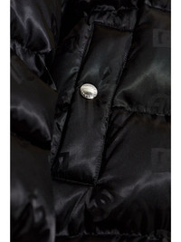 down jacket Highlights - Black - Front zip fastening - Down-feather filling - Front button fastening - Classic hood - All-over logo print - Long sleeves - Two side slit pockets Made in Italy Composition Polyester 100%, Down 100%, Feather 100%, Polyamide 100%