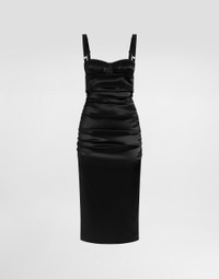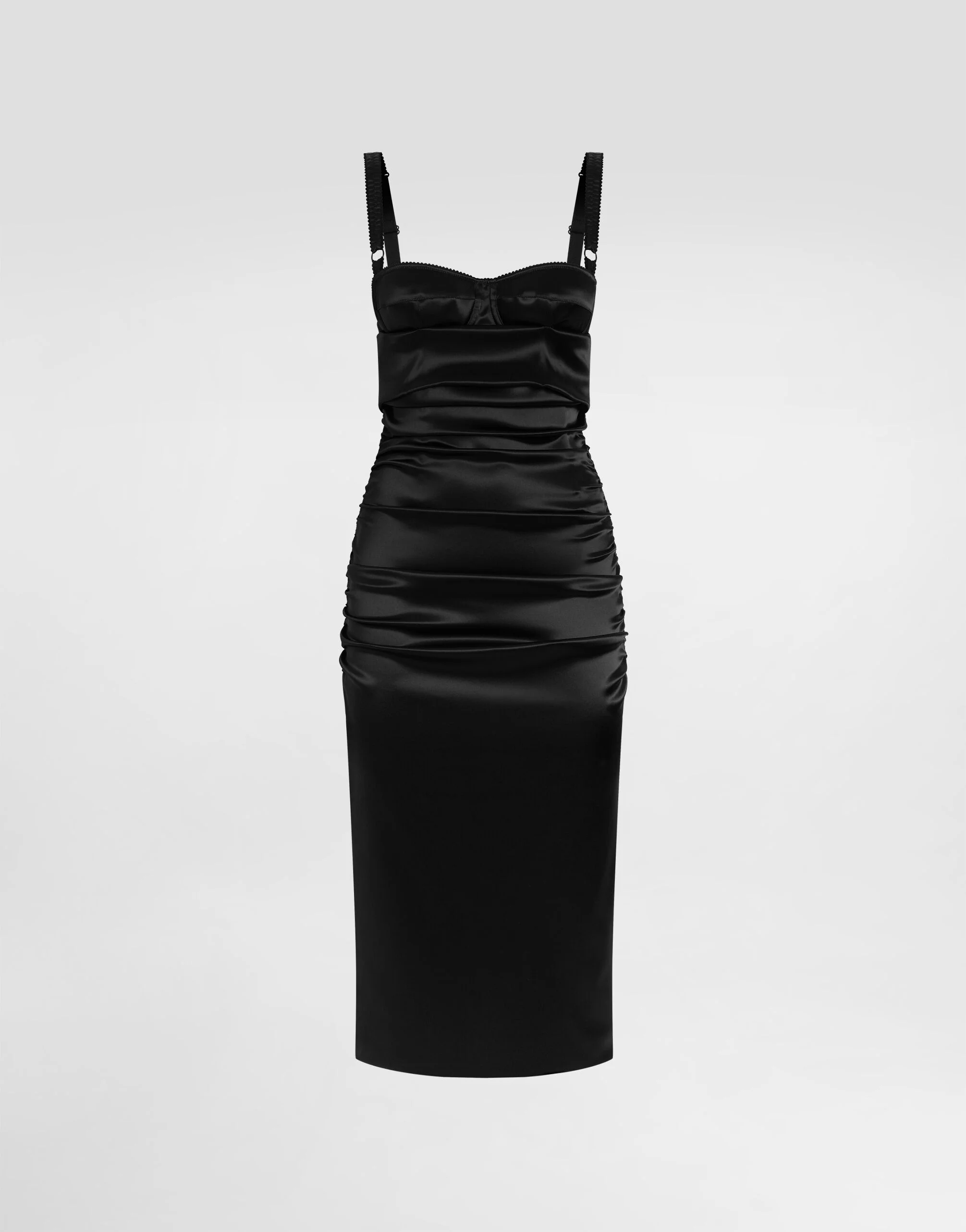 The Spring/Summer 2025 Women’s Collection is celebrating Italian beauty through bold and charismatic femininity. The 50s-inspired lingerie is the star, intermingling with fitted dresses, corsets and oversize trench coats. The iconic jackets have been updated with cropped cuts and modern inserts, while the floral prints add a romantic edge. The eveningwear shines with light fabrics and crystals, accompanied by look-defining accessories, from iconic bags to the cross earrings. Draped stretch satin calf-length dress with bra-style detailing: • Black • Sweetheart neckline • Slightly padded cups • Sleeveless with adjustable stretch straps • Stretch silk satin lining • Rear zipper and hook-and-eye fastening • The piece measures 75 cm from the waist down on a size IT 40 • The model is 175 cm tall and wears a size IT 40 • Made in Italy External composition: 65% Acetate 29% Polyamide 6% Spandex Internal composition: 92% Silk 8% Spandex