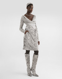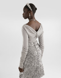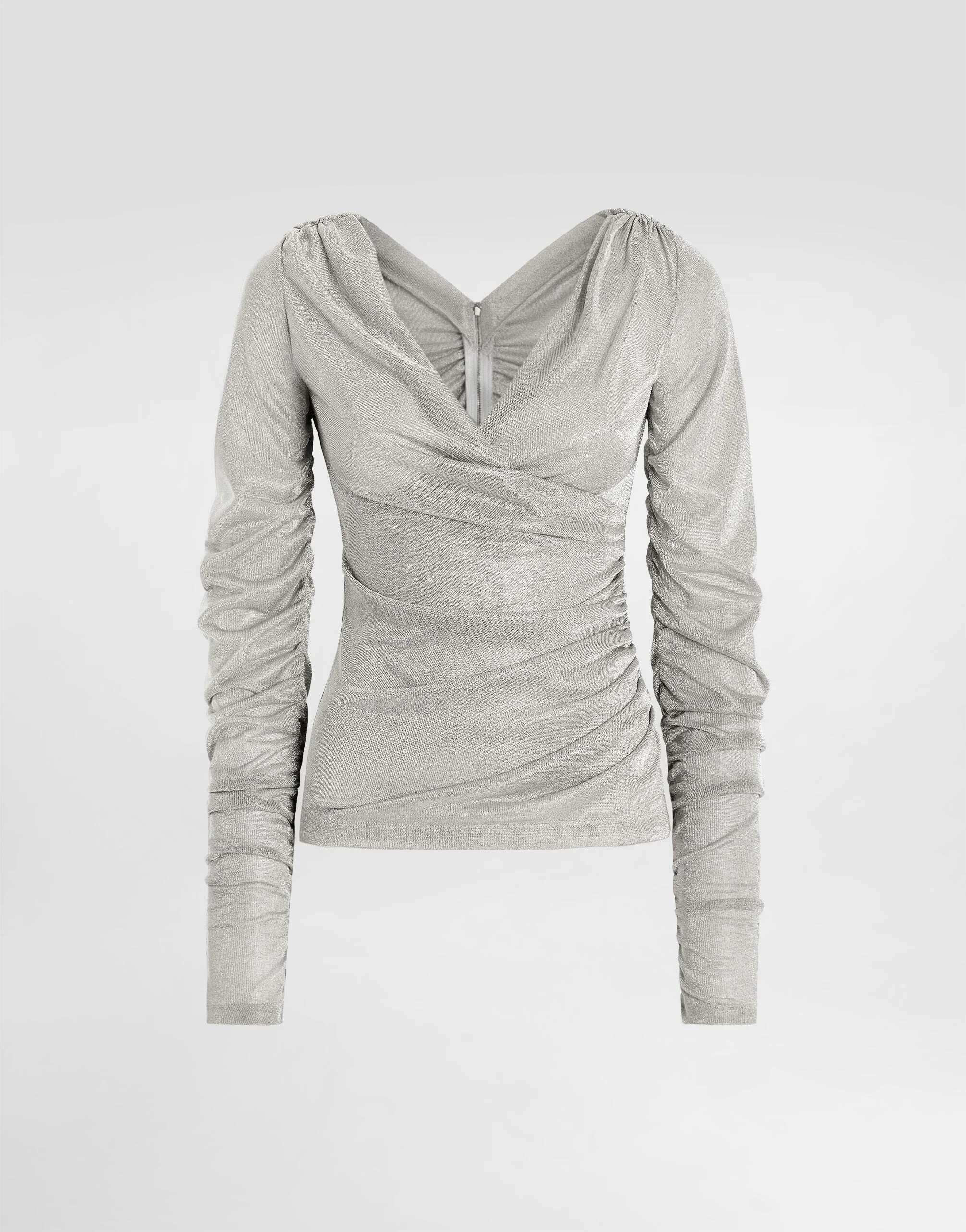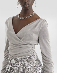 Elegance, tailored lines and sparkling details define the Dolce&Gabbana Holiday collection. Sixties inspirations blend with a contemporary aesthetic. For him, structured jackets and cuts that enhance the silhouette for her, silver brocade and crystals illuminate festive looks. Each piece stands out for its fine materials, attention to detail and distinctive style. This lame jersey top is the epitome of modern elegance, perfect for adding a sparkling touch to your evening outfits. With draped details and a crisscross design, this piece is a must-have for those who like to stand out in style. Lame jersey top: • Silver • V-neck front and back • Drape on the hips, center back and shoulders • Long sleeves • Invisible zip closure at the back • Length from shoulder is 42 cm on size 40 IT • Made in Italy External composition: 70% Viscose, 30% Polyester