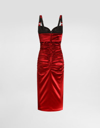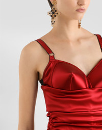The Spring/Summer 2025 Women’s Collection is celebrating Italian beauty through bold and charismatic femininity. The 50s-inspired lingerie is the star, intermingling with fitted dresses, corsets and oversize trench coats. The iconic jackets have been updated with cropped cuts and modern inserts, while the floral prints add a romantic edge. The eveningwear shines with light fabrics and crystals, accompanied by look-defining accessories, from iconic bags to the cross earrings. Draped satin calf-length dress with conical cups: • Red • Sweetheart neckline • Padded conical cups • Sleeveless with adjustable stretch straps • Stretch silk satin lining • Rear zipper and hook-and-bar fastening • The piece measures 75 cm from the waist down on a size IT 40 • The model is 175 cm tall and wears a size IT 40 • Made in Italy External composition: 65% Acetate 29% Polyamide 06% Spandex Internal composition: 92% Silk 08% Spandex