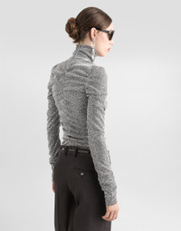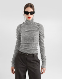 The Everyday Women's Collection reimagines contemporary daily wear with Dolce&Gabbana's signature style codes. Iconic fabrics mix with standout details like embroidered flowers, crystals, and jewel buttons, infusing elegance into every look. Gray animal print accented with green and purple, hyper-geometric jewelry, voluminous shapes and transparencies add unique touches. Men's tweed is reinvented with graphic twists, creating distinctive pieces that reflect refined sensuality. Draped sequined turtle-neck top: • Silver • High neck • Long, draped sleeves • Form fitting • Organzine lining • Zipper fastening at the back • The piece measures 54 cm from the center back on a size IT 40 • The model is 175 cm tall and wears a size IT 40 • Made in Italy External composition: 45% Polyester 37% Metallic Polyester 18% Polyamide Internal composition: 77% Polyamide 23% Spandex