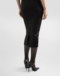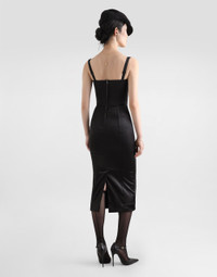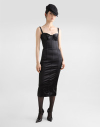 The Women's Black Sicily Collection reinforces Dolce&Gabbana's iconic fabrics and codes rooted in Italian heritage. Sensual silhouettes, highlighted by floral prints and refined corsetry, evoke an intriguing elegance, while the iconic black lace, satin, and velvet dominate the collection. Denim in various shades of blue introduces a contemporary twist, balancing the classic and modern. Embroidered crosses, medals, and jewelry add a sophisticated touch. Satin calf-length corset dress with bra detail: • Black • Sweetheart neckline • Partially-padded cups with underwiring • Boned bodice • Sleeveless with adjustable stretch straps • Stretch silk satin lining • Rear zipper and hook-and-bar fastening • The piece measures 101 cm from the center back on a size IT 40 • The model is 175 cm tall and wears a size IT 40 • Made in Italy External composition: 62% Acetate 27% Polyamide 6% Spandex 5% Silk Internal composition: 65% Acetate 29% Polyamide 06% Spandex