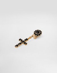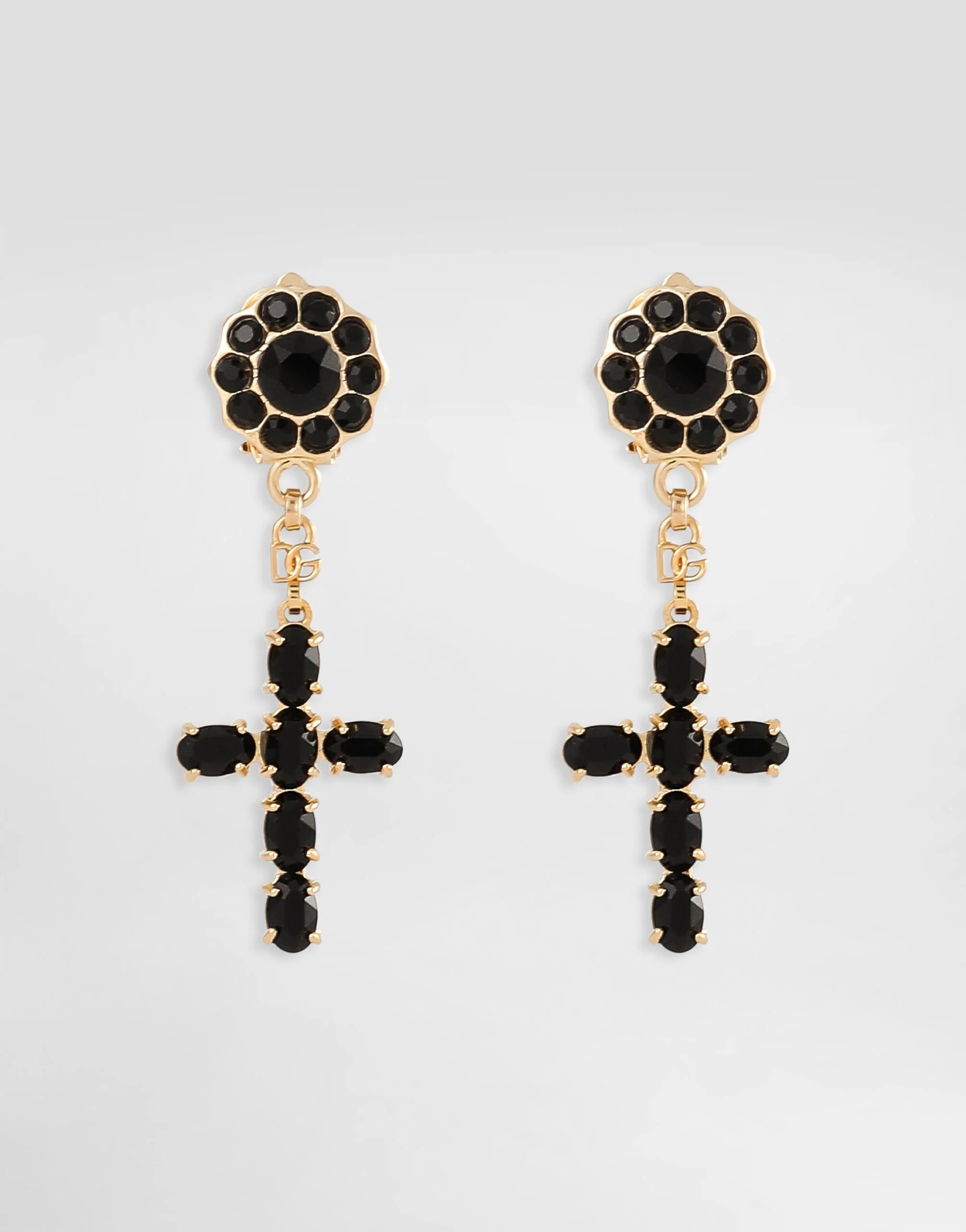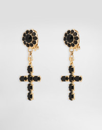 In the “WOMAN SS 24” Collection, the imagery of old Sicily interacts with the masculine, with sensual shapes, lace, nude tones and delicate overlays, to create pieces that move amid clean silhouettes, the elegance of the 1960s, the contrasts of black and white and luxurious textures. The designers are reworking their signature style and their iconic Sicilia black color to convey an aware, seductive and confident Sicilian WOMAN who is imbued with sensuality. Drop earrings with rhinestone crosses: • Black and Gold • Clip-on fastening • Height: 5 cm • Nickel-free and hypoallergenic materials • Small DG-logo details • Made in Italy External composition: 70% Brass 30% Glass