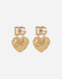 The Dolce&Gabbana Jewelry Collection is filled with unique pieces boasting great craftsmanship. Contemporary accessories with original and exclusive DG logo details, featuring different plated finishes, will be perfect for finishing off any look with style. Drop earrings with hammered-effect hearts and the DG logo: • Gold • Clip-on fastening • Height: 5.5 cm • Nickel-free and hypoallergenic materials • Engraved logo • Made in Italy External composition: 100% Brass