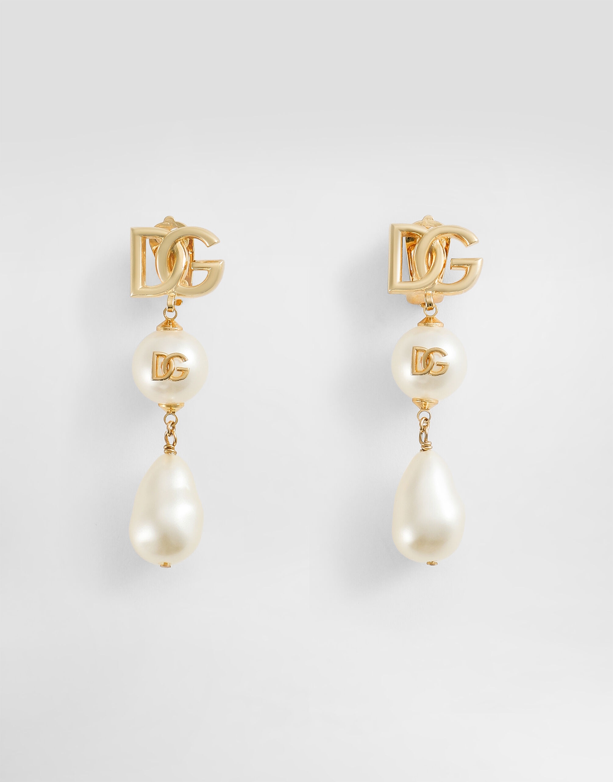 The Everyday Women's Collection reimagines contemporary daily wear with Dolce&Gabbana's signature style codes. Iconic fabrics mix with standout details like embroidered flowers, crystals, and jewel buttons, infusing elegance into every look. Gray animal print accented with green and purple, hyper-geometric jewelry, voluminous shapes and transparencies add unique touches. Men's tweed is reinvented with graphic twists, creating distinctive pieces that reflect refined sensuality. Drop earrings with teardrop accents, cabochons and the DG logo: • White • Height: 5.5 cm • Clip-on fastening • Nickel-free and hypoallergenic materials • Engraved logo • Made in Italy Composition: 60% Brass 40% Acrylic glass