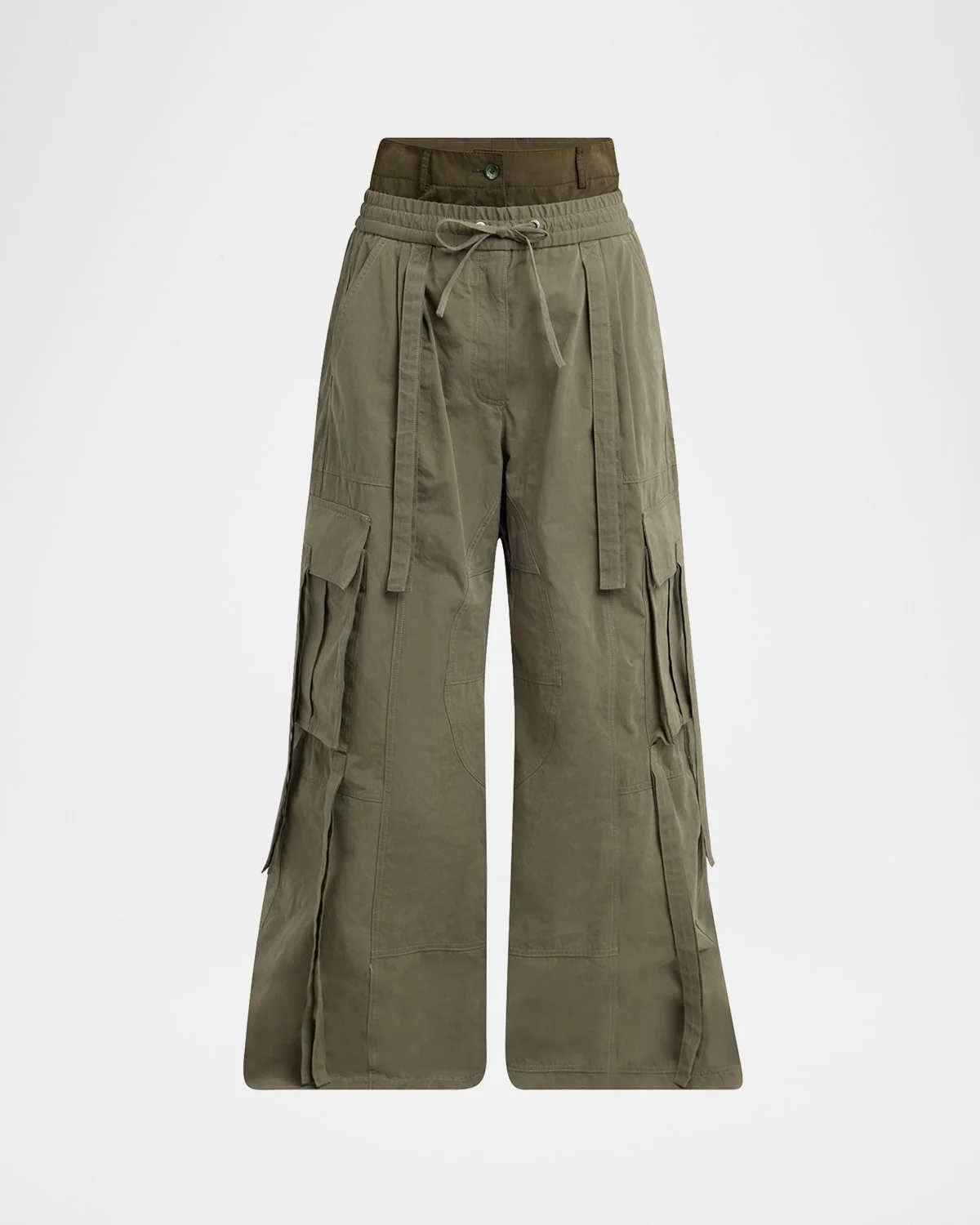 Dolceamp;Gabbana cargo trousers are crafted of a twotone cottonblend featuring a double waistband, exaggerated leg cargo pockets, and multiple ties High rise Angled side patch pockets Back zip pockets Leg flap patch pockets Wide legs Full length Button/drawstring pullon style Cotton/polyester/nylon/polyamide Made in Italy