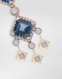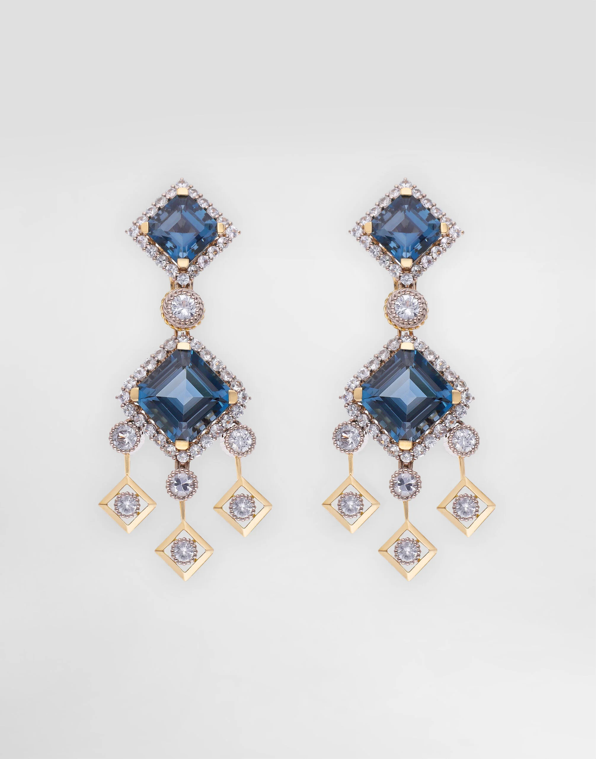 These earrings, made of 18 Kt white and yellow gold, are a refined combination of intense blue-hued topazes and colorless sapphires. The impeccable combination of these gems, along with the luster of gold, gives the jewel a timeless elegance. On the back, a tag with the Dolce&Gabbana logo adds a distinctive touch, a seal of authenticity and style. Gemological Details: 4 "London" topazes: blue color, square shape with rounded corners, step cut; 102 sapphires: colorless, round shape, brilliant cut. Made in Italy White and yellow gold 750/000