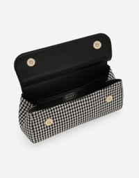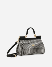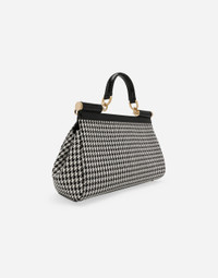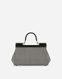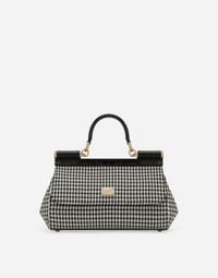 The brand icon par excellence, this Sicily bag features new details. Featuring new proportions, it comes in houndstooth fabric and is embellished by the branded tag featuring two metal plating finishes. Medium Sicily handbag in houndstooth fabric: • Black and White • Front flap with hidden double magnetic fastening • Branded tag featuring two metal plating finishes • Top handle and adjustable, detachable strap in crocodile-print calfskin • Fabric lining and flat pocket • Item comes with a branded dust bag • Measurements: H17 x W25 x D9 cm • Made in Italy External composition: 45% Virgin wool 25% Calfskin 30% Viscoses Internal composition: 70% Calfskin 25% Cotton 5% Acrylic