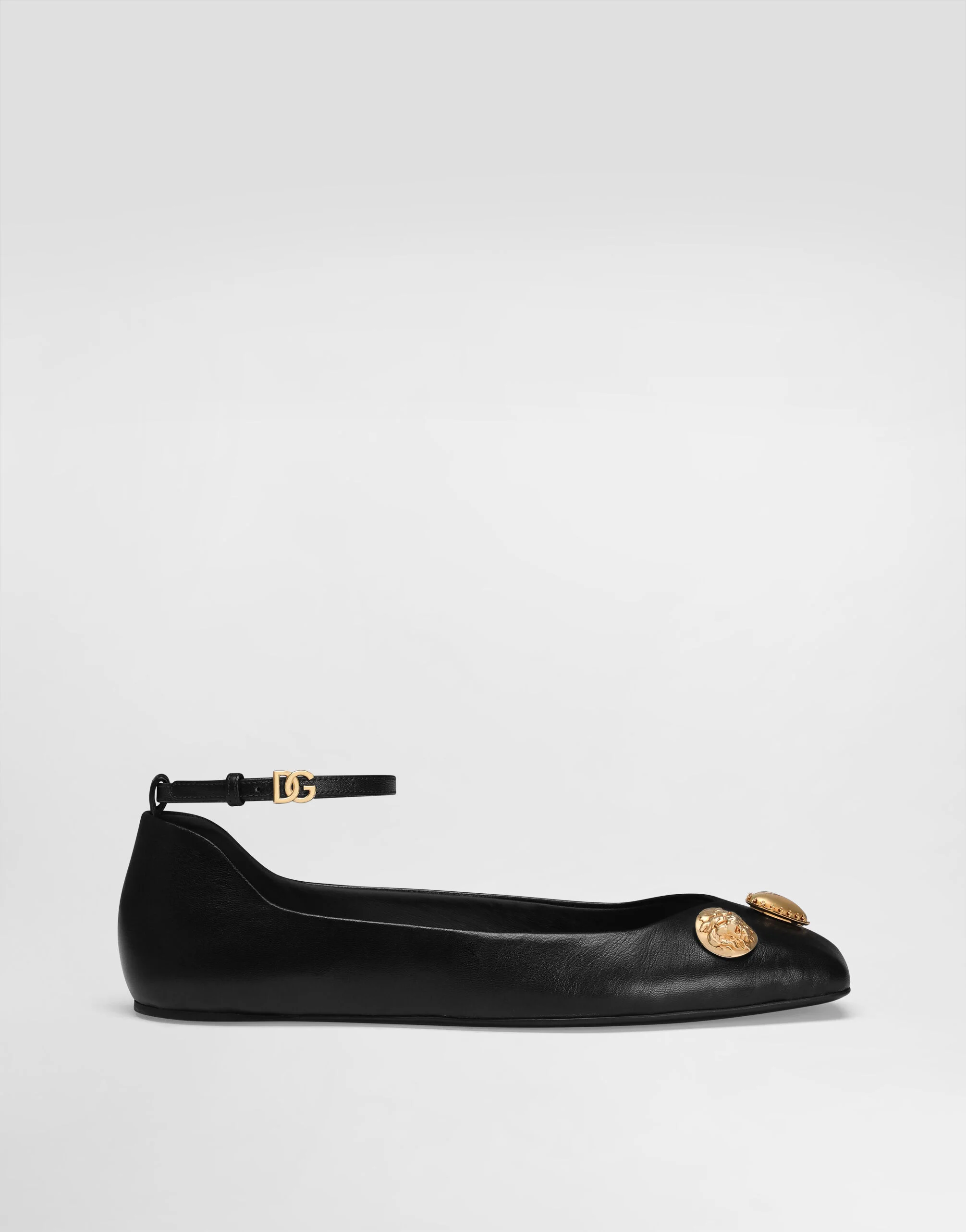 This formal ballet flat shoe combines elegance and craftsmanship, with precious embroidery that enriches the classic design. Perfect for adding a touch of discreet luxury to your everyday outfits. Goatskin flats with embroidery: • Black • Edina shape • One-piece leather sole • Quilted fabric insole • Insole customization with label • Embroidery with stones • Customization with DG cross logo • Light gold plating • Item equipped with black cotton bag and black embossed box • Heel height 05 mm • Made in Italy External Composition: 100% Goatskin Internal Composition: 69% Lambskin, 31% Goatskin