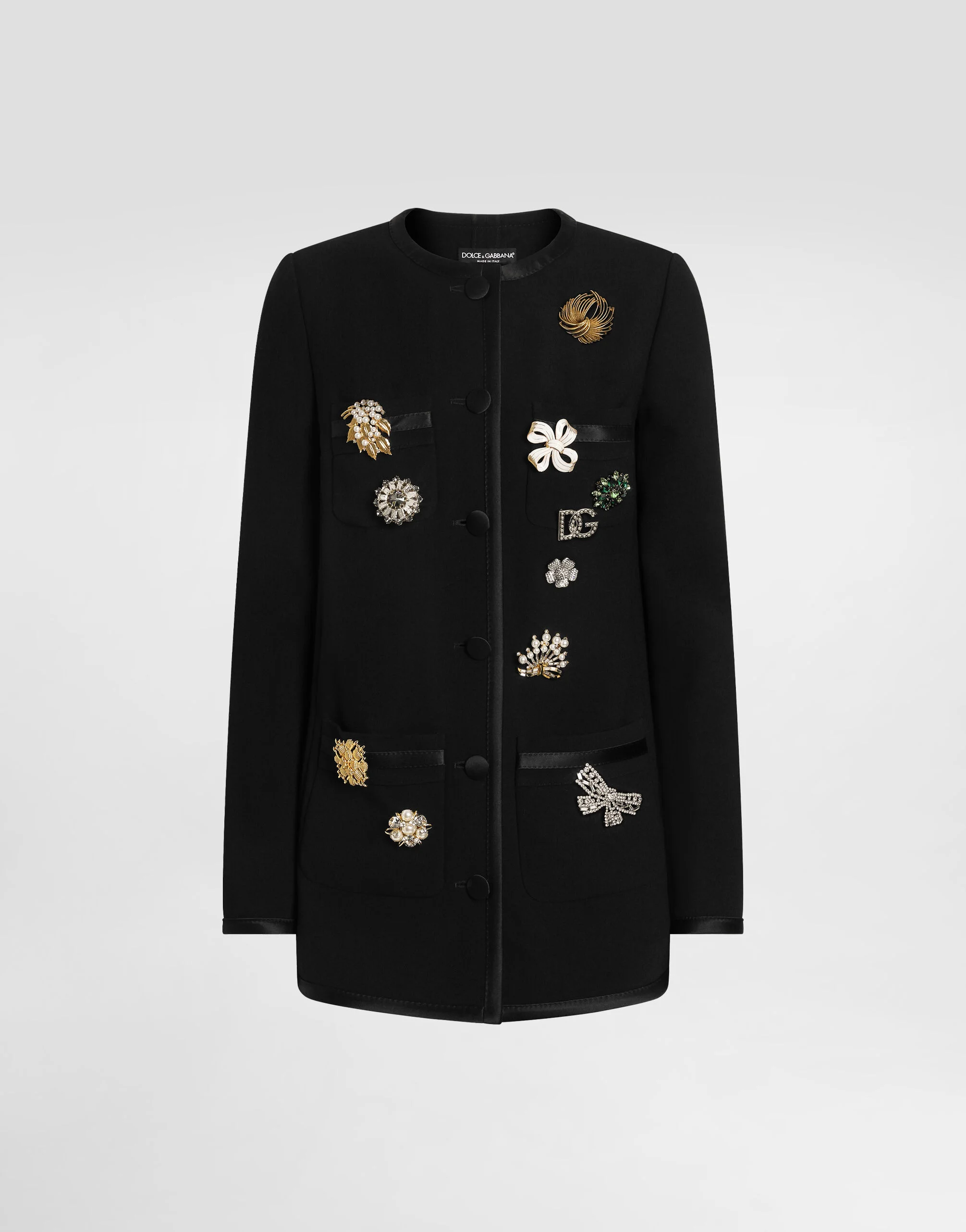 This stylish and sophisticated jacket stands out for its modern design and attention to detail, perfect for adding a touch of class to any outfit. Single-breasted jacket in double crepe: • Black • Crew neck • Reinforced with tulle on the perimeter edges, pockets and cuffs • Long sleeves with elbow cut • Doubled tulle patch pockets at chest and waist • Lacing with buttonholes and a small poussoir on the upper part of the neckline • Pins applied • The model is 175 cm tall and wears size 40 IT • Made in Italy External Composition: 88% Virgin Wool, 9% Silk, 3% Polyester