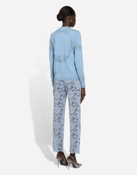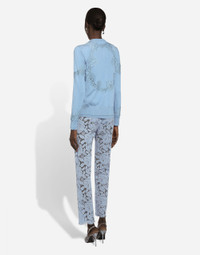In the FW 24/25 DNA Collection, the rules of classic tailoring have been reworked with an innovative feel. New raschel weave techniques feature on micro-jackets and coats, and original textures are woven on trench coats, skirts, jacquard suits and shirts. The color palette made up of Nero Sicilia black, Milky White and Ocean Blue is also original. The iconic bags in fine nappa leather and “Pyton FC Machine” finish off the looks. Tailored branded floral cordonetto lace pants with logo: • Light blue • Dolce high waist • Front slant pockets • Welt back pockets • Belt loops • Inner leg: 74 cm • Hem: 17 cm • Zipper and cannete-covered button with DG logo • The model is 175 cm tall and wears a size IT 40 • Made in Italy External composition: 41% Viscose 35% Cotton 24% Polyamide Internal composition: 91% Silk 09% Spandex