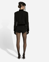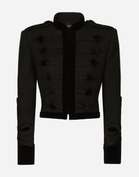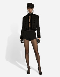 Menswear and womenswear mix and mingle, influencing one another and creating tailoring that embraces endless nuances, from the boldest to the most sophisticated, to define the rules of eternally classy femininity. A monochrome retelling in Nero Sicilia black, embellished by golden touches and rhinestones, adorning clean lines and incorporating stylish fabrics such as velvet, chiffon, lace, organza, and unique mesh details, the expression of authentic beauty for dresses, shirts and accessories. Double wool gabardine tailcoat with epaulets: • Black • Mandarin collar • Long sleeves • Stretch silk satin lining • Hook-and-bar fastenings • The piece measures 45 cm from the center back on a size IT 40 • The model is 175 cm tall and wears a size IT 40 • Made in Italy External composition: 80% Virgin Wool 20% Cotton Internal composition: 83% Silk 10% Virgin Wool 07% Spandex