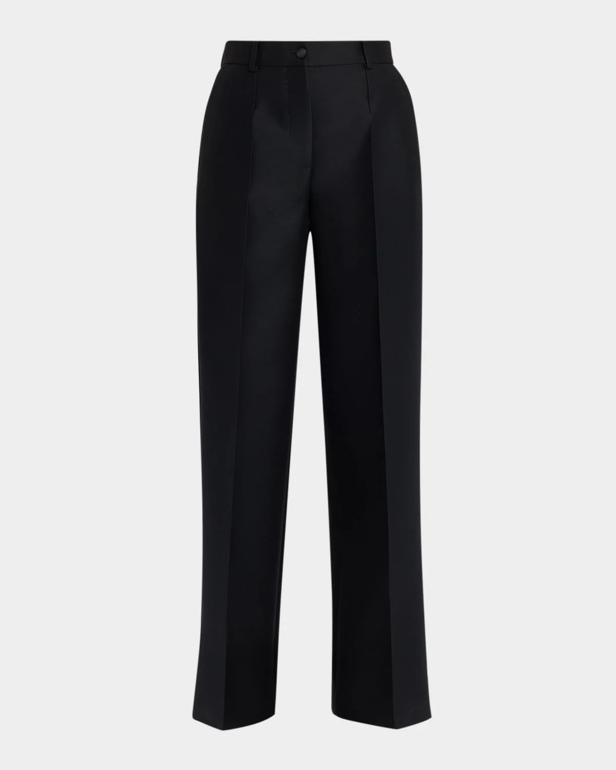 - Dolce&Gabbana tailored trousers crafted from a heavy wool blend with elongating pintuck seaming - Mid rise sits high on hip - Slanted side and back buttoned besom pockets - Full length - Straight legs - Button/zip fly; belt loops - Virgin wool/silk - Made in Italy