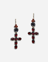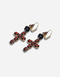Leverback earrings featuring three elements elegantly arranged from top to bottom in the following order. a clover of red rhodolite garnets, a refined black jade rose and a Latin cross composed of oval red rhodolite garnets. The "DOLCE&GABBANA" logo is engraved on the back of the clasp. Technical specifications. • Gold 18 Kt • Gemstones. 18 round and oval red rhodolite garnets, 2 black jade roses Yellow 18 kt Gold