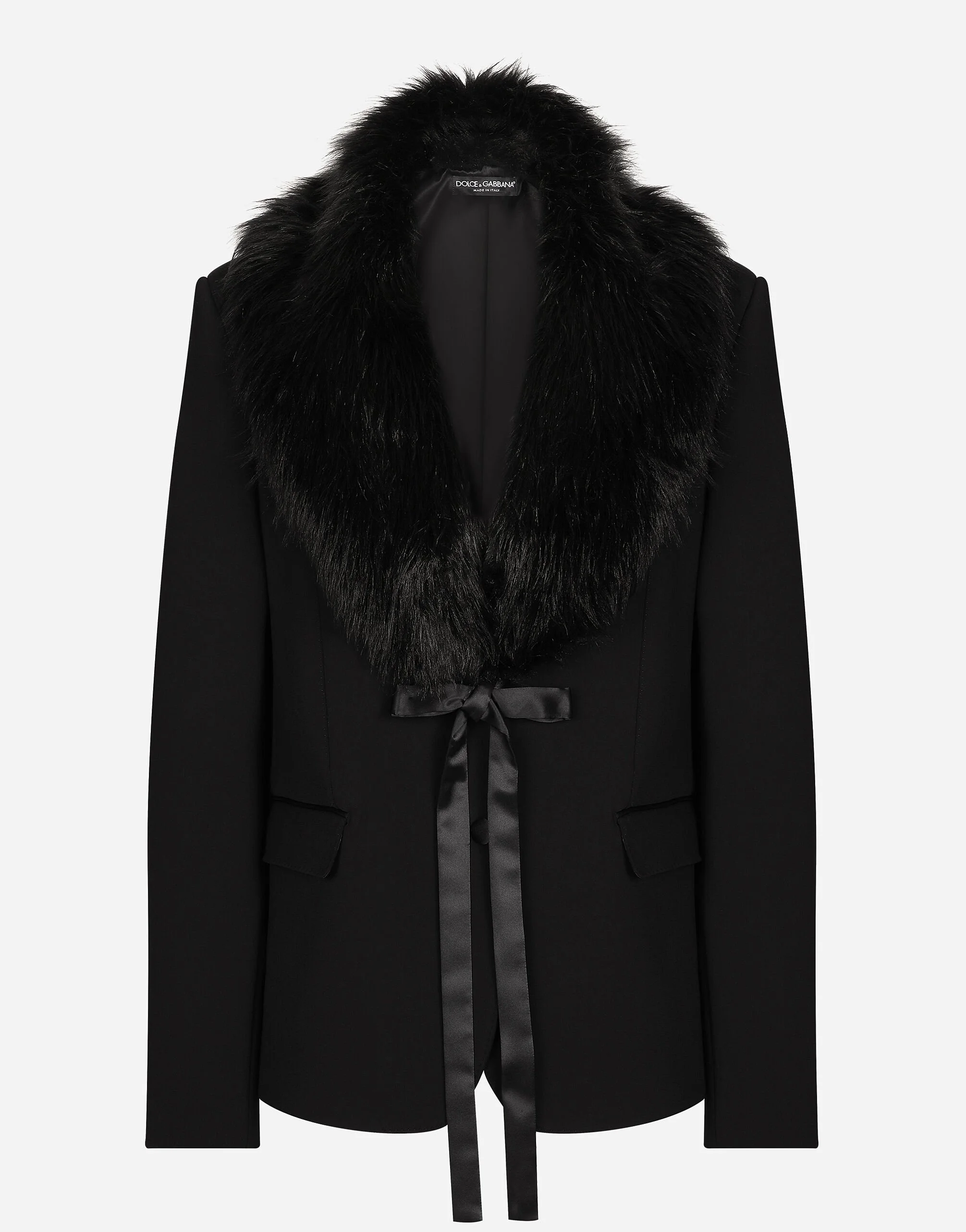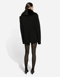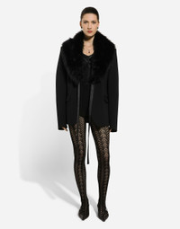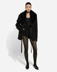 Inspired by 80s fashion photography, the Black Sicily collection masterfully blends masculine and feminine elements, pairing tailored cuts and corset details for the FW 24/25 season. A new vision of the iconic Nero Sicilia black is conveyed through contemporary and sensual looks: jackets and skirts in all-over glen plaid pair with openwork socks, while the 50s-inspired Mun shoes with Eva heel go with the houndstooth Sicily bag featuring crocodile-print leather inserts. Wool jacket with faux fur collar: • Black • Detachable shawl collar • Long sleeves • Flap pockets • Comfortable fit • Silk satin lining • Satin-covered button fastenings • The piece measures 73 cm from the center back on a size IT 40 • The model is 175 cm tall and wears a size IT 40 • Made in Italy External composition: 53% Virgin Wool 32% Polyamide 11% Silk 3% Spandex 1% Polyester Internal composition: 100% Silk Faux fur composition: 82% Modacrylic 10% Polyester 8% Silk