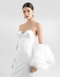 The Spring/Summer 2025 Women’s Collection is celebrating Italian beauty through bold and charismatic femininity. The 50s-inspired lingerie is the star, intermingling with fitted dresses, corsets and oversize trench coats. The iconic jackets have been updated with cropped cuts and modern inserts, while the floral prints add a romantic edge. The eveningwear shines with light fabrics and crystals, accompanied by look-defining accessories, from iconic bags to the cross earrings. Faux fur muff: • White • Stretch silk satin lining • Elasticated bracelet-style cuff • Made in Italy External composition: 60% Acrylic 32% Modacrylic 8% Polyester Internal composition: 92% Silk 8% Spandex