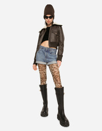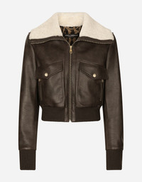 Faux leather and sheepskin jacket: • Brown • Shearling collar • Ribbed hem and cuffs • Regular fit • Pockets • Leopard-print stretch satin lining • Front zipper fastening • The piece measures 50 cm from the back of the neck on a size IT 40 • The model is 175 cm tall and wears a size IT 40 • Made in Italy Care And Details External composition: 100% Polyester Internal composition: 97% Polyester 3% Spandex