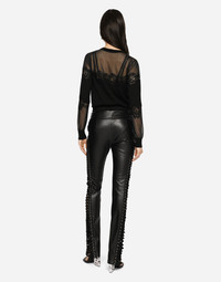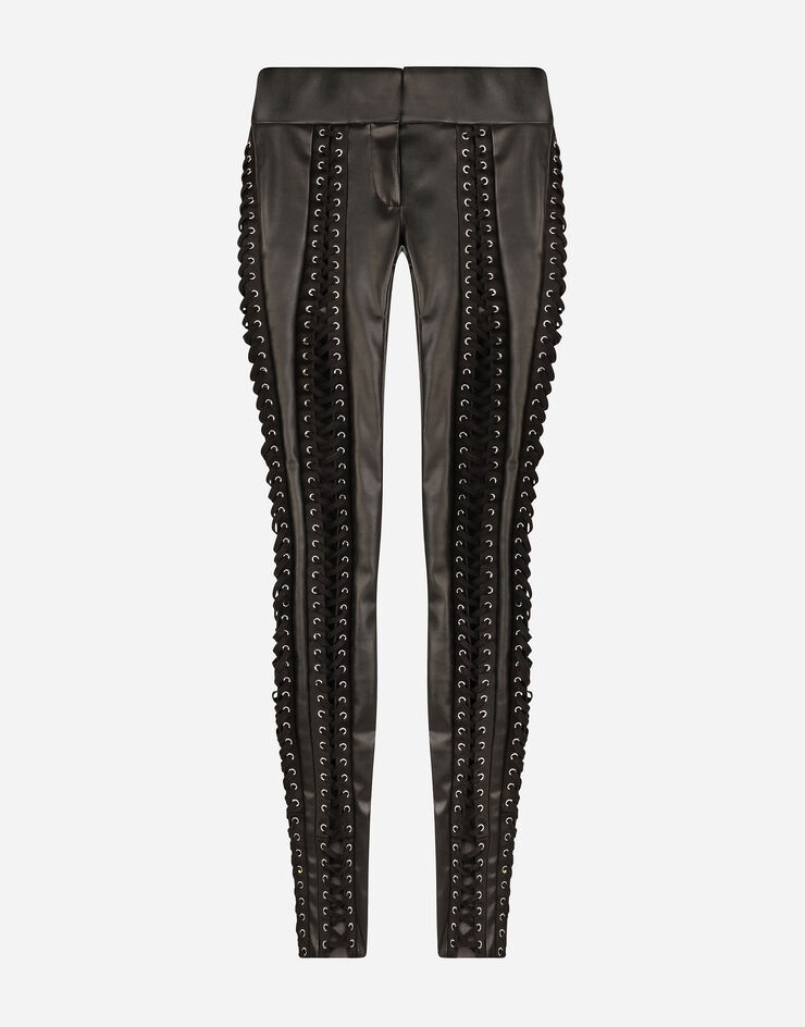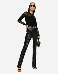 Dolce&Gabbana always conveys a sensual and glamorous feel in its collections. These skinny corset-inspired pants come in faux leather with laces and eyelets and are sure to put your personality on display and give you contemporary looks: • Low rise • Pockets • Welt back pockets • Inner leg: 94 cm • Zipper and press-stud button fastenings • The model is 175 cm tall and wears a size IT 40 • Made in Italy Care And Details External composition: 53% Polyurethane 42% Polyester 5% Silk