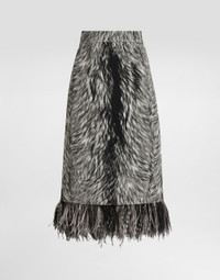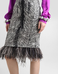 The Everyday Women's Collection reimagines contemporary daily wear with Dolce&Gabbana's signature style codes. Iconic fabrics mix with standout details like embroidered flowers, crystals, and jewel buttons, infusing elegance into every look. Gray animal print accented with green and purple, hyper-geometric jewelry, voluminous shapes and transparencies add unique touches. Men's tweed is reinvented with graphic twists, creating distinctive pieces that reflect refined sensuality. Stretch silk charmeuse calf-length pencil skirt with fur print and feathered detailing: • Animal print • High-waisted • Stretch silk crepe de chine lining • Rear zipper and hook-and-bar fastening • The piece measures 52.50 cm from the waist down on a size IT 40 • The model is 175 cm tall and wears a size IT 40 • Made in Italy The difference in the print placement that you may find on this product is a feature of Dolce&Gabbana’s “Handmade” pieces. A detail that makes every garment or accessory unique and exclusive. External composition: 91% Silk 09% Spandex Internal composition: 91% Silk 09% Spandex