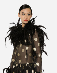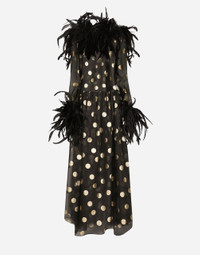 Menswear and womenswear mix and mingle, influencing one another and creating tailoring that embraces endless nuances, from the boldest to the most sophisticated, to define the rules of eternally classy femininity. A monochrome retelling in Nero Sicilia black, embellished by golden touches and rhinestones, adorning clean lines and incorporating stylish fabrics such as velvet, chiffon, lace, organza, and unique mesh details, the expression of authentic beauty for dresses, shirts and accessories. Long polka-dot silk organza dress with rooster feather details: • Black • Feathered round neck • Long sleeves with feathered cuffs • Stretch silk crepe de chine underskirt • Rear zipper and hook-and-bar fastening • The piece measures 116 cm from the waist down on a size IT 40 • The model is 175 cm tall and wears a size IT 40 • Made in Italy External composition: 100% Silk Internal composition: 91% Silk 09% Spandex