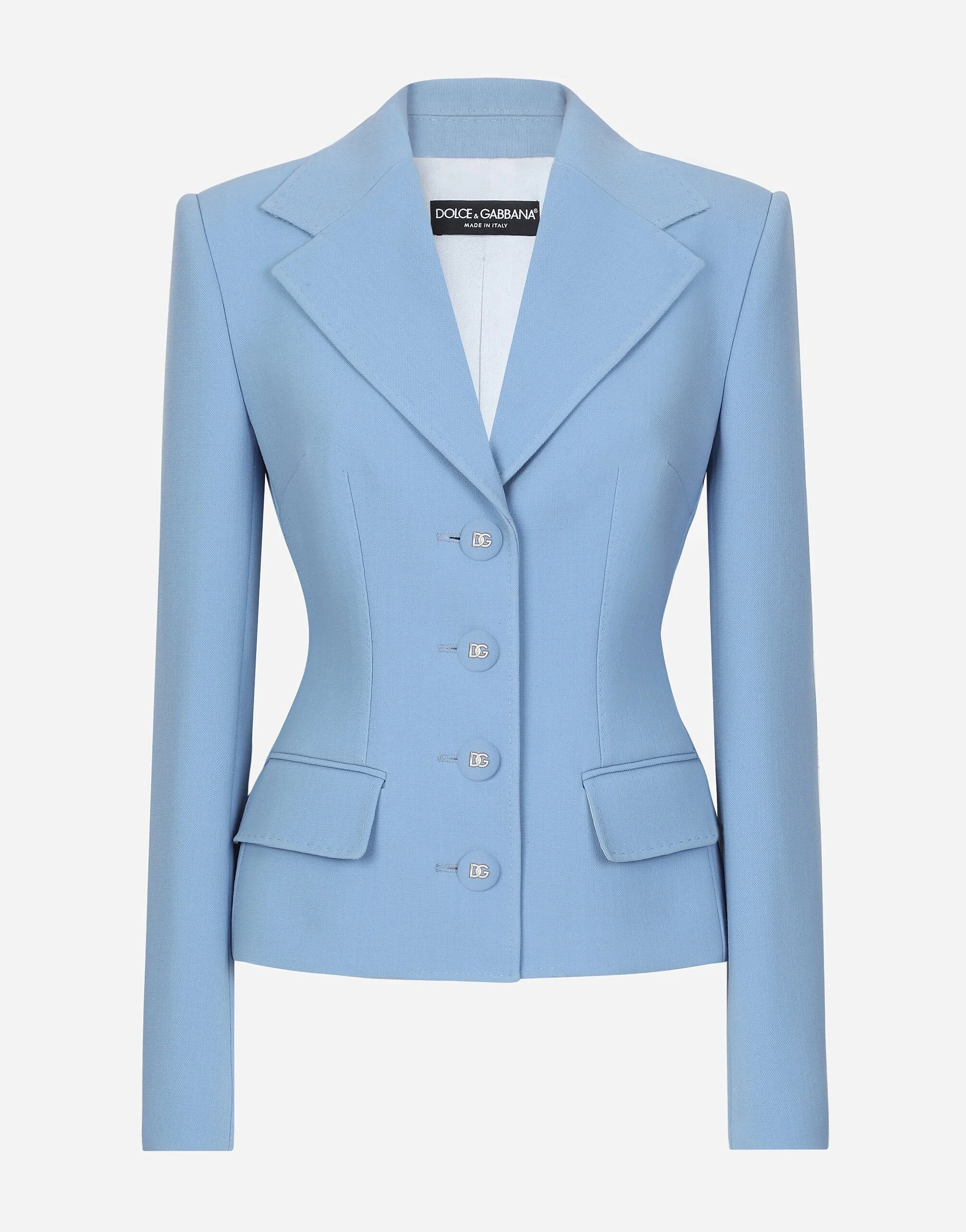 In the FW 24/25 DNA Collection, the rules of classic tailoring have been reworked with an innovative feel. New raschel weave techniques feature on micro-jackets and coats, and original textures are woven on trench coats, skirts, jacquard suits and shirts. The color palette made up of Nero Sicilia black, Milky White and Ocean Blue is also original. The iconic bags in fine nappa leather and “Pyton FC Machine” finish off the looks, as well as the Muns shoes inspired by the Global Ambassador, Mun KaYoung. Single-breasted double wool crepe jacket: • Light blue • Notched lapels • Long sleeves • Flap pockets • Tonal silk satin lining • Cannete-covered button fastenings and DG logo • The piece measures 57 cm from the center back on a size IT 40 • The model is 175 cm tall and wears a size IT 40 • Made in Italy External composition: 100% Virgin Wool Internal composition: 100% Silk