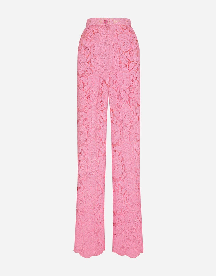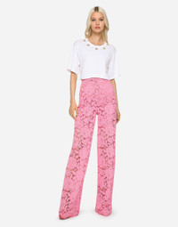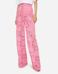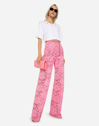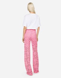 Flared branded stretch lace pants: • Dolce high waist • Front slant pockets • Stretch silk crepe de chine high-waisted panties • Inner leg: 88 cm • Hem: 30 cm • Zipper and canneté-covered button with DG logo • The model is 175 cm tall and wears a size IT 40 • Made in Italy Care And Details External composition: 51% Viscose 24% Cotton 20% Polyamide 5% Spandex Internal composition: 91% Silk 9% Spandex