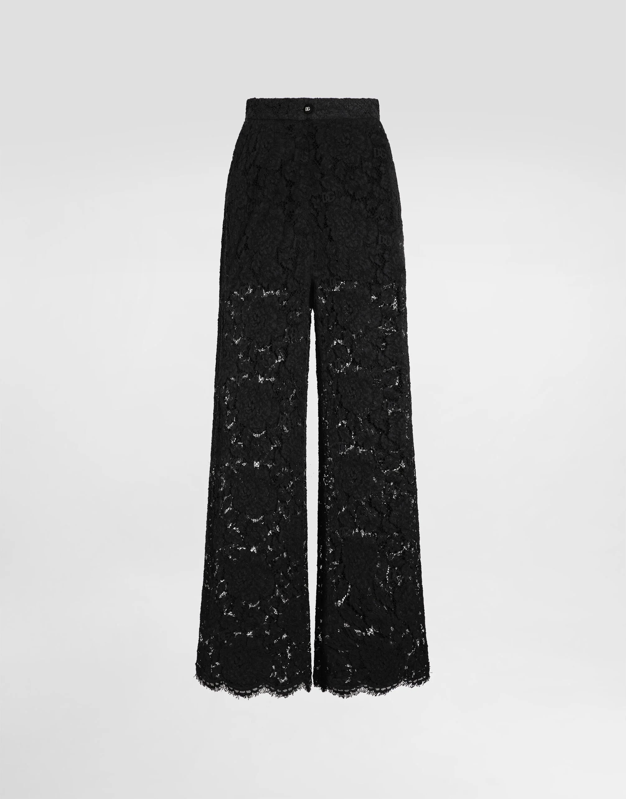 Flared branded stretch lace pants: • Dolce high waist • Front slant pockets • Stretch silk crepe de chine high-waisted panties • Inner leg: 88 cm • Hem: 30 cm • Zipper and canneté-covered button with DG logo • The model is 175 cm tall and wears a size IT 40 • Made in Italy Care And Details External composition: 51% Viscose 24% Cotton 20% Polyamide 5% Spandex Internal composition: 91% Silk 9% Spandex