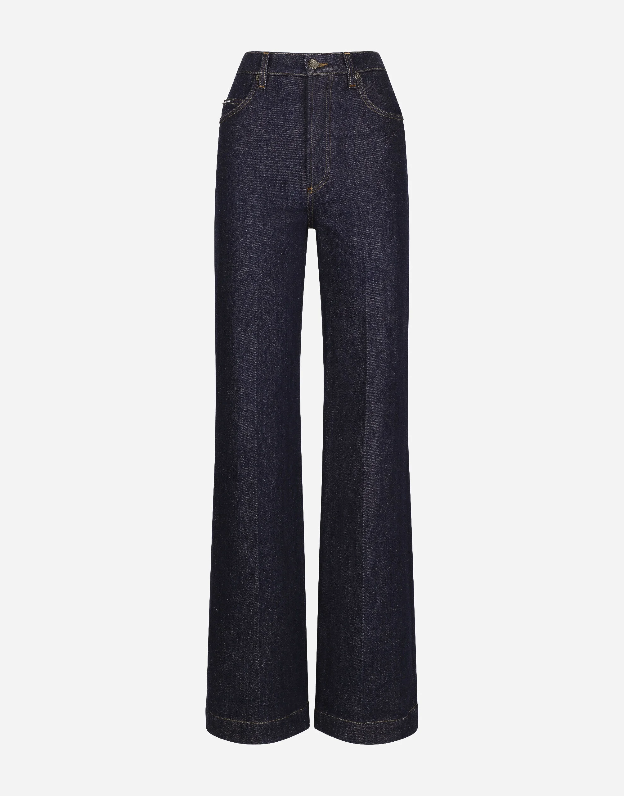 The spirit of the 1960s is taking over the new Flower Power collection. The focus is a head-to-toe floral look built around pairing and layering rose, anemone and floral bouquet maxi-prints. A cosmopolite poised between playful and sexy, this woman interprets the austerity and elegance of the 1960s, harking back to boldly opulent imagery that here at Dolce&Gabbana is condensed and reinterpreted through silhouettes, ample proportions and airy shapes, bringing femininity and sensuality to the forefront. Flared cotton denim jeans: • Blue • High-waisted • 5 pockets • Branded metal and leather tag • Branded label on the coin pocket • Inner leg: 90 cm • Hem: 29.5 cm • Zipper and branded metal button fastening • The model is 175 cm tall and wears a size IT 40 • Made in Italy External composition: 100% Cotton