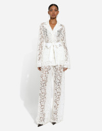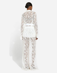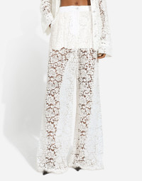 The DNA collection is distinguished by timeless shapes, bringing together three concepts: Sicilian flair, tailoring and sensuality. Nero Sicilia black and optical white predominate and pair with colors that catapult us onto the island of Sicily and make us dream. The designers channel the timeless wardrobe made up of creations that are instantly unmistakable in their simplicity, presenting us with sophisticated beauty loaded with meaning and symbolism that transcends fashion. Flared branded floral stretch cordonetto lace pants: • White • Stretch Dolce high waist • Front slant pockets • Stretch silk crepe de chine shorts • Inner leg: 88 cm • Hem: 37 cm • Zipper and canneté-covered button with DG logo • The model is 175 cm tall and wears a size IT 40 • Made in Italy External composition: 56% Viscose 39% Cotton 5% Polyamide Internal composition: 91% Silk 9% Spandex