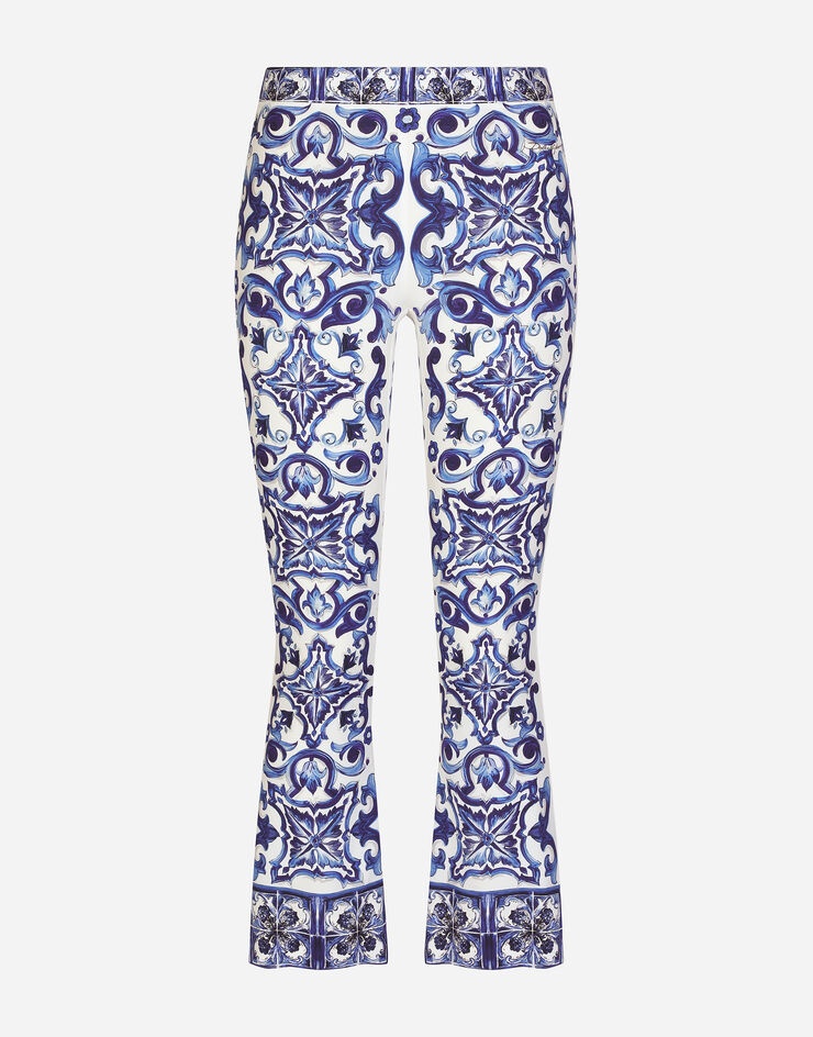 Deep blue shades, which bring the color of clear skies and the deep Sicilian sea to mind, paired with the pure white of seaside homes to provide the inspiration for the Blu Mediterraneo line. These trumpet-leg pants in silk charmeuse emphasize the concepts of originality, lightness and femininity that Dolce&Gabbana has always favored: • Regular rise • Inner leg: 70 cm • Hem: 22.8 cm • Invisible zip and hook-and-eye fastening on the side • The model is 175 cm tall and wears a size IT 40 • Made in Italy Care And Details External composition: 94% Silk 6% Spandex