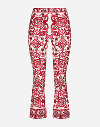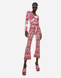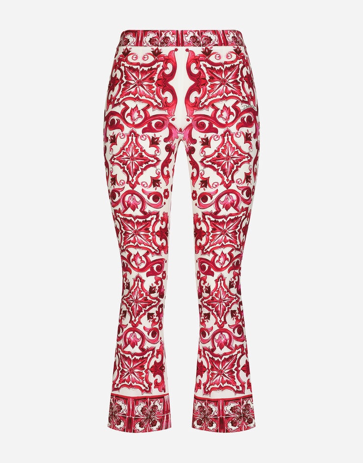 Flared trumpet-leg silk charmeuse pants with Majolica print: • Multi-colored • Regular rise • Inner leg: 70 cm • Hem: 22.8 cm • Invisible zipper and hook-and-eye fastening on the side • The model is 175 cm tall and wears a size IT 40 • Made in Italy The difference in the print placement that you may find on this product is a feature of Dolce&Gabbana’s “Handmade” pieces. A detail that makes every garment or accessory unique and exclusive. Care And Details External composition: 94% Silk 6% Spandex