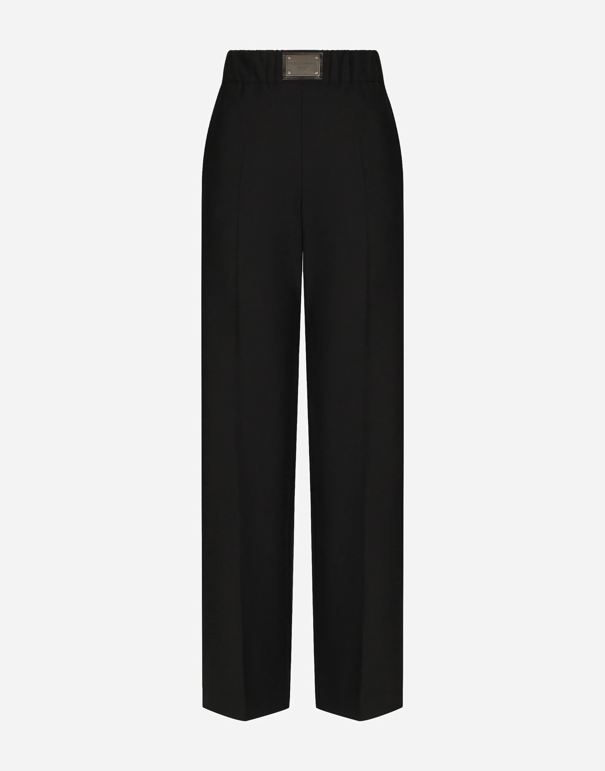 Flared stretch wool pants with logo tag: • Black • Regular rise • Stretch belt with logo tag • Slant front pockets • Inner leg: 87 cm • Hem: 27.5 cm • Rear zipper and hook-and-eye fastening • The model is 175 cm tall and wears a size IT 40 • Made in Italy Care And Details External composition: 55% Wool 41% Polyester 4% Spandex