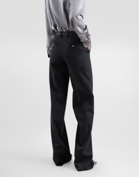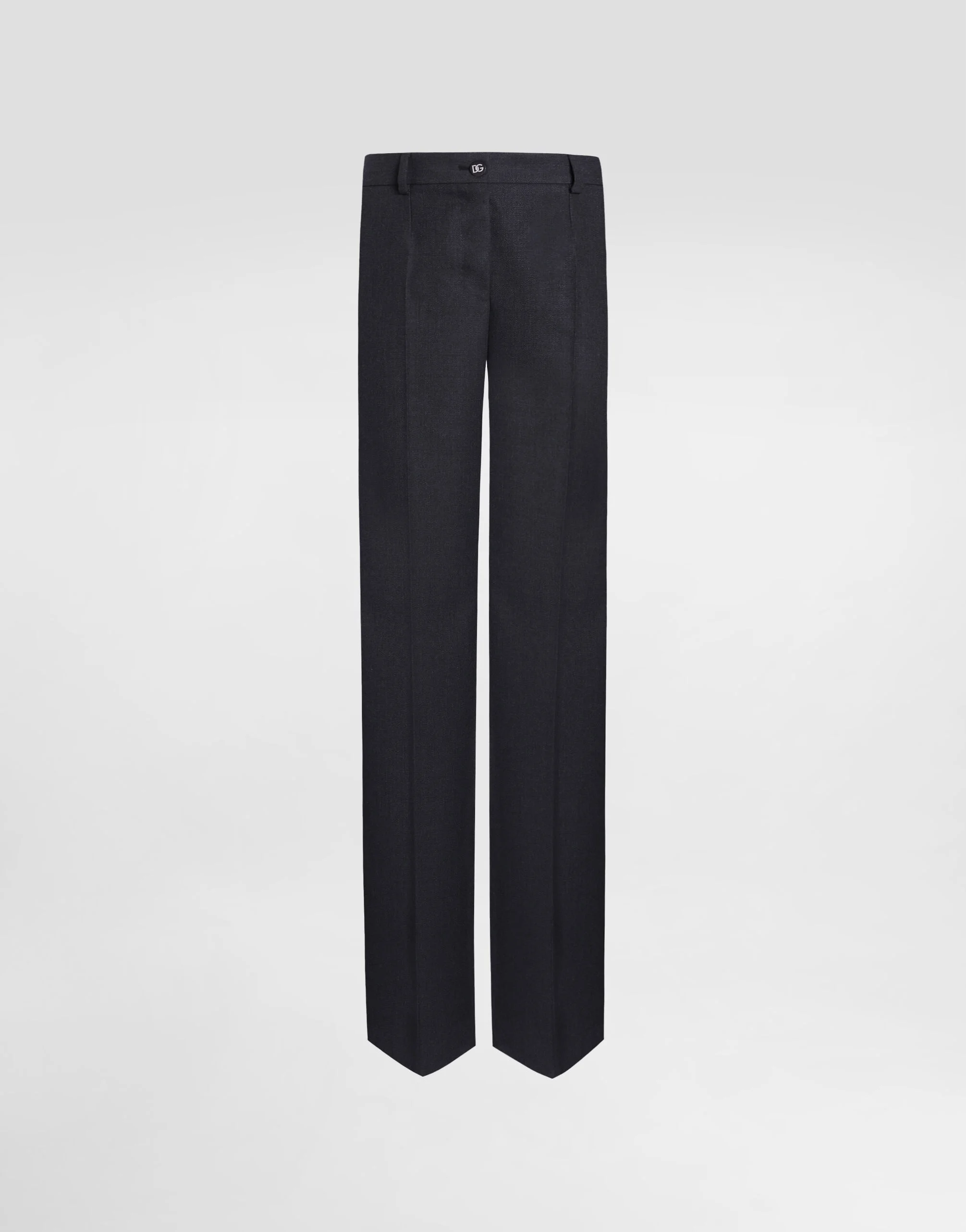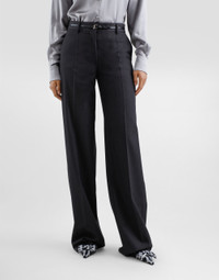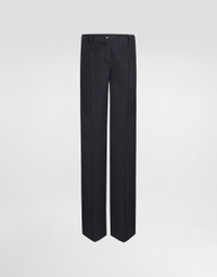 The Everyday Women's Collection reimagines contemporary daily wear with Dolce&Gabbana's signature style codes. Iconic fabrics mix with standout details like embroidered flowers, crystals, and jewel buttons, infusing elegance into every look. Gray animal print accented with green and purple, hyper-geometric jewelry, voluminous shapes and transparencies add unique touches. Men's tweed is reinvented with graphic twists, creating distinctive pieces that reflect refined sensuality. Flared woolen pants: • Gray • Regular rise • Front slant pockets • Welt back pockets • Belt loops • Inner leg: 90 cm • Hem: 26 cm • Zipper and button fastening with DG logo • The model is 175 cm tall and wears a size IT 40 • Made in Italy External composition: 100% Virgin Wool