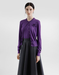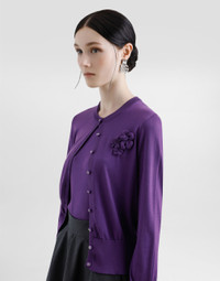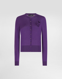 The Everyday Women's Collection reimagines contemporary daily wear with Dolce&Gabbana's signature style codes. Iconic fabrics mix with standout details like embroidered flowers, crystals, and jewel buttons, infusing elegance into every look. Gray animal print accented with green and purple, hyper-geometric jewelry, voluminous shapes and transparencies add unique touches. Men's tweed is reinvented with graphic twists, creating distinctive pieces that reflect refined sensuality. Silk round-neck cardigan: • Purple • 18-gauge knit • Round neck • Long sleeves • French seam armholes • Dense hand • Ribbed neck and hem • Regular fit • Button fastenings • The piece measures 57 cm from the shoulder seam on a size IT 40 • The model is 175 cm tall and wears a size IT 40 • Made in Italy External composition: 100% Silk
