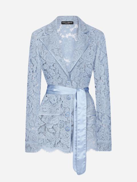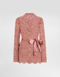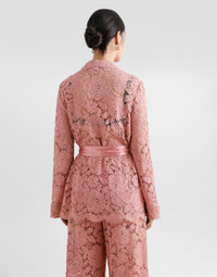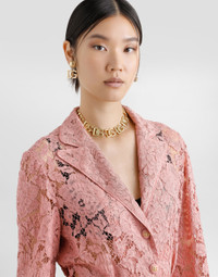 The Women’s DNA Collection is introducing a new side to femininity, which comes in shades of rose quartz, poised between sheerness and opacity, lightness and structure, formality and sensuality. Geometric Dolce Jackets, jacquard pajamas and floral brocade dresses intertwine with ultra-romantic designs. The DG print becomes an iconic statement, while Cordonetto lace and hints of Sicily Black embody the essence of a determined yet romantic femininity. Floral cordonetto lace pajama shirt with DG logo: • Pink • Notched lapel collar • Long sleeves • Patch pockets • Regular fit • Cannete-covered button fastenings with metal DG logo and a crepe de chine belt • The piece measures 75 cm from the center back on a size IT 40 • The model is 175 cm tall and wears a size IT 40 • Made in Italy External composition: 30% Cotton 20% Polyamide 20% Silk 30% Viscose