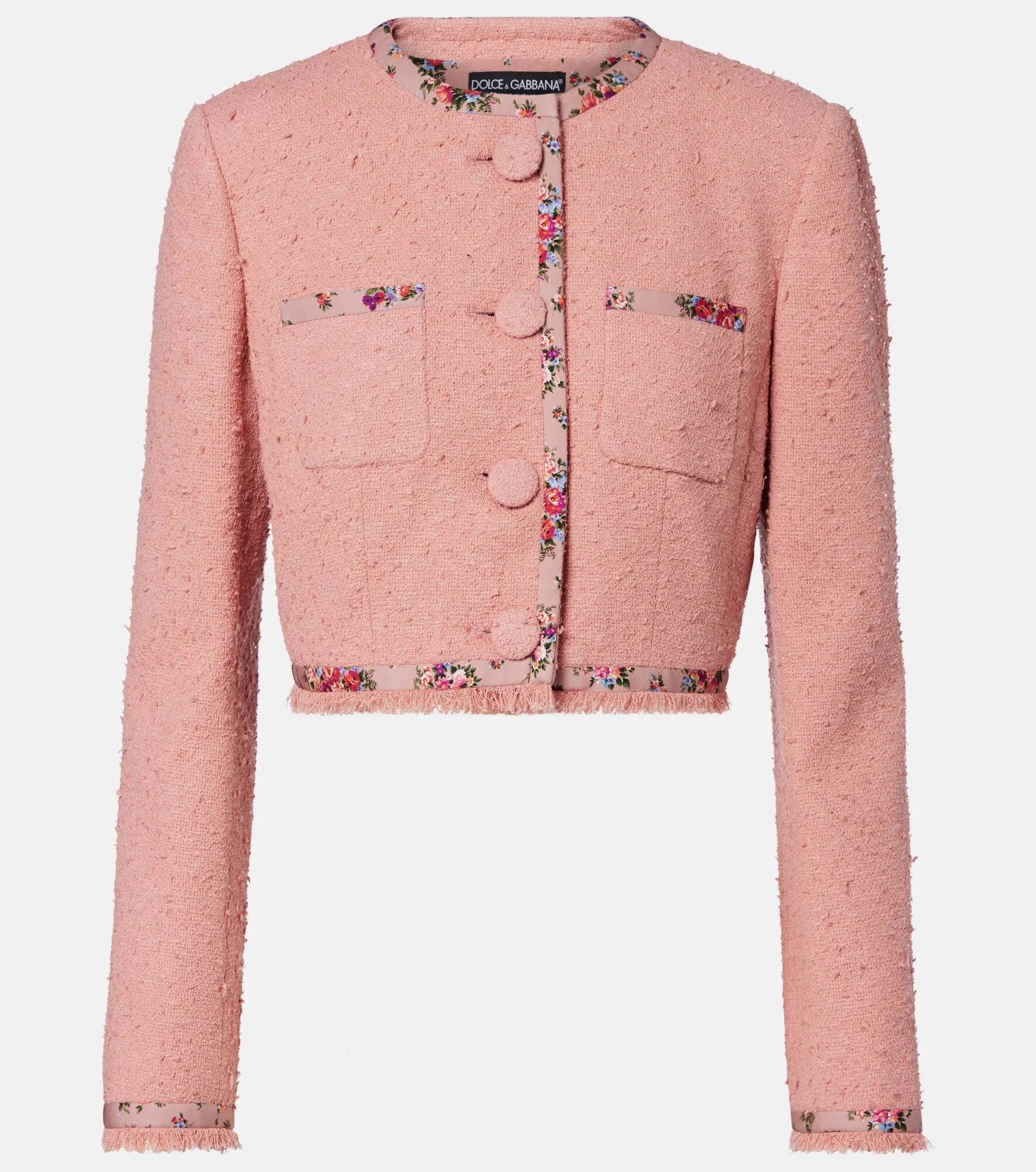 Sicilian culture is on display in Dolce&Gabbana's aesthetic, with bold styles inspired by the brand's Italian heritage. Crafted from pink cotton-blend tweed, this jacket is shaped into a cropped silhouette with buttoned front closure and an all-over floral print. Product Details - Material: 67% cotton, 25% silk, 6% polyamide, 2% elastane - Care instructions: dry clean - Made in Italy - Color: pink - Designer color name: Rosa Polvere Scuro - Lining: 94% silk, 6% elastane - Closure: buttoned front - Pockets: angled chest pockets - Item number: P01122903 Size & Fit - True to size - Shoulder pad inserts - Straight fit - Non-stretchy fabric - Cropped - The model seen in the picture is 178cm-5'10" and wearing a size IT 40