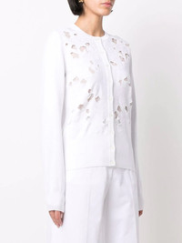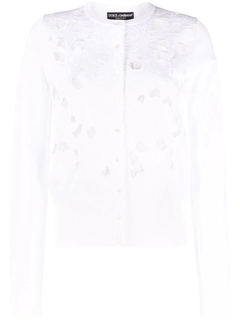 floral-embroidery openwork cardigan Dolce & Gabbana revisit their Italian roots for SS22, designing mainly white pieces with silhouettes and constructions inspired by tradition and heritage. Knitted in silk and cotton, this cardigan is adorned with tonal floral embroidery on the front, complemented by openwork detailing. Made in Italy Composition Silk 100%, Cotton 100%, Polyester 100% SIZE & FIT Model measurements Height 5 ft 10 in(1.78 m) Bust/Chest 33.07 in(84 cm) Hips 35.82 in(91 cm) Waist 25.98 in(66 cm) FittingInformation This piece fits true to size. We recommend you get your regular size Cut for a slim fit Made with a mid-weight fabric Washing instructions Dry Clean Only