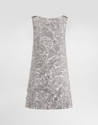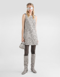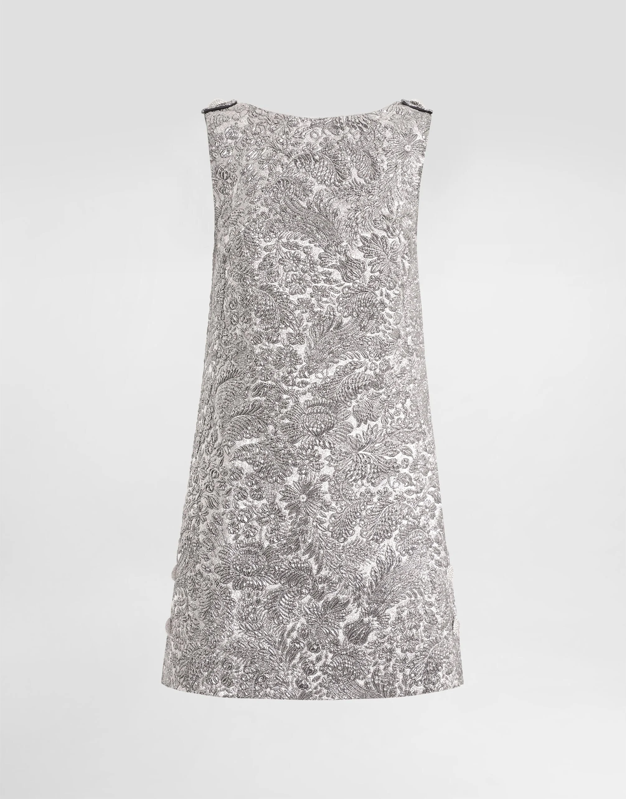 Elegance, tailored lines and sparkling details define the Dolce&Gabbana Holiday collection. Sixties inspirations blend with a contemporary aesthetic. For him, structured jackets and cuts that enhance the silhouette for her, silver brocade and crystals illuminate festive looks. Each piece stands out for its fine materials, attention to detail and distinctive style. This sleeveless floral jacquard dress is the essence of everyday elegance, perfect for a sophisticated and refined look. Sleeveless floral jacquard dress: • Silver • Crew neck at the front, deep at the back • Side slits with jewel buttons • Toggle on the shoulder with jewel button • Side pockets • Zip closure • Lined • Length from waist is 45 cm for size 40 IT • Length from shoulder is 51 cm for size 40 IT • Made in Italy External composition: 33% Metallic Polyester, 32% Acrylic, 16% Virgin Wool, 13% Silk, 6% Polyamide Internal composition: 94% Polyester, 6% Elastane