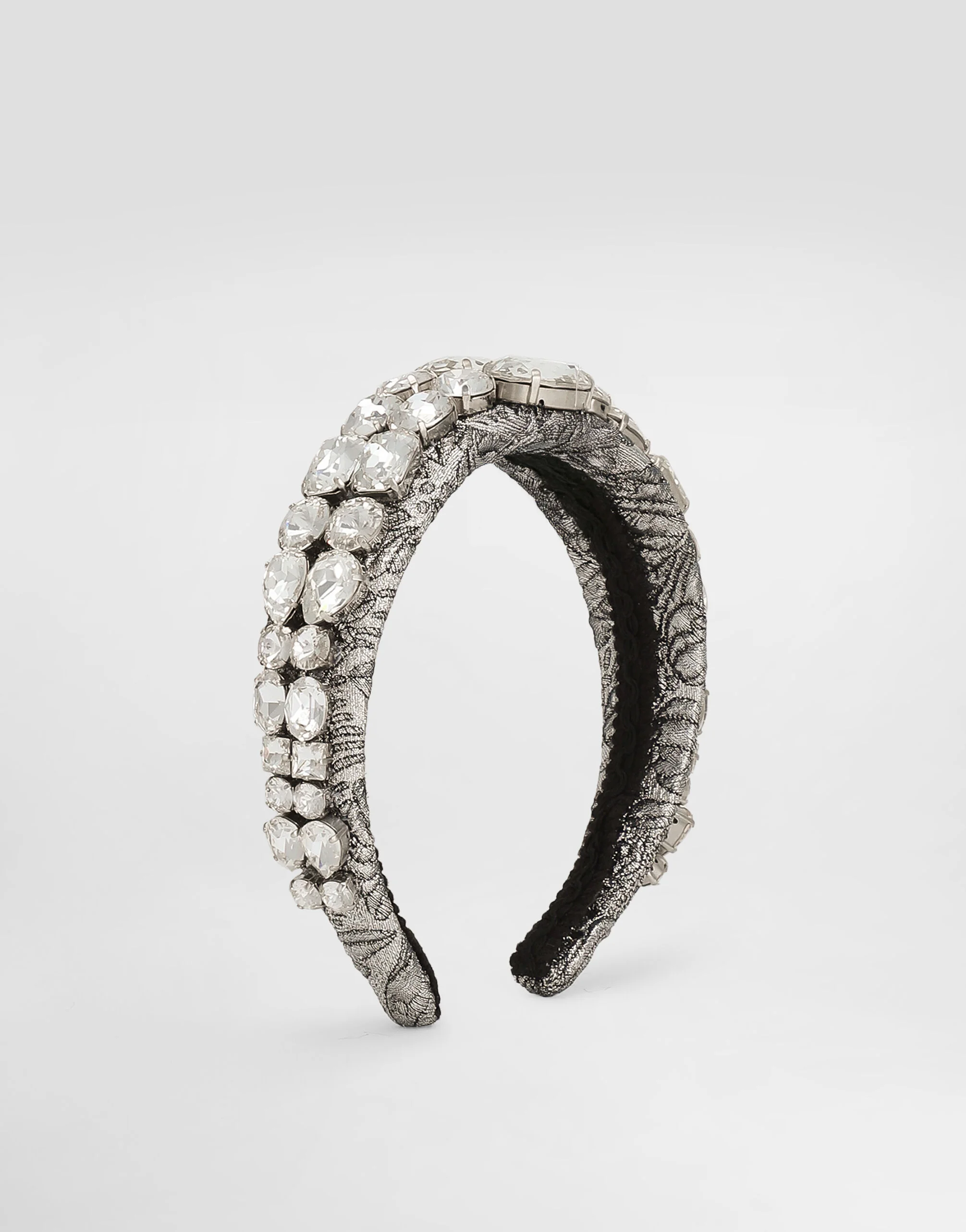 Elegance, tailored lines and sparkling details define the Dolce&Gabbana Holiday collection. Sixties inspirations blend with a contemporary aesthetic. For him, structured jackets and cuts that enhance the silhouette for her, silver brocade and crystals illuminate festive looks. Each piece stands out for its fine materials, attention to detail and distinctive style. This headband is a distinctive accessory that combines elegance and creativity. Rhinestone embroidery on a floral jacquard fabric adds a touch of sparkle, perfect for completing any look with a touch of glamour. Floral jacquard headband with rhinestone embroidery: • Multi-colored • Made in Italy External composition: 33% Metallic Polyester, 32% Acrylic, 16% Virgin Wool, 13% Silk, 6% Polyamide