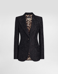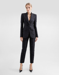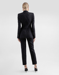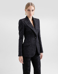 The Women’s DNA Collection is introducing a new side to femininity, which comes in shades of rose quartz, poised between sheerness and opacity, lightness and structure, formality and sensuality. Geometric Dolce Jackets, jacquard pajamas and floral brocade dresses intertwine with ultra-romantic designs. The DG print becomes an iconic statement, while Cordonetto lace and hints of Sicily Black embody the essence of a determined yet romantic femininity. Single-breasted floral quilted jacquard Turlington jacket with DG logo: • Black • Peak lapels • Long sleeves • Flap pockets • Leopard-print twill lining • Cannete-covered button fastenings and DG logo • The piece measures 70.5 cm from the rear collar seam on a size IT 40 • The model is 175 cm tall and wears a size IT 40 • Made in Italy External composition: 49% Cotton 32% Polyester 19% Silk Internal composition: 100% Polyester