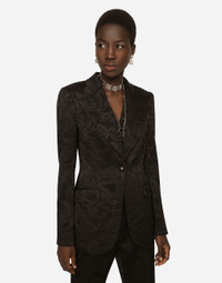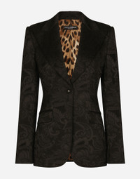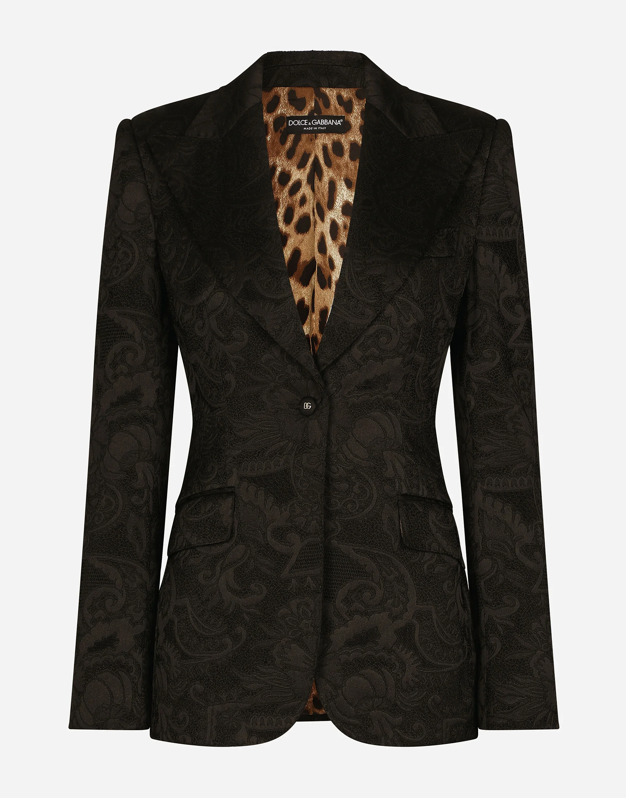 Floral jacquard Turlington blazer: • Peak lapels • Long sleeves • Flap pockets • Leopard-print stretch satin lining • Canneté-covered button fastening with DG logo • The piece measures 70 cm from the rear collar seam on a size IT 40 • The model is 175 cm tall and wears a size IT 40 • Made in Italy Care And Details External composition: 57% Polyester 24% Acetate 17% Viscose 2% Spandex Internal composition: 97% Polyester 3% Spandex
