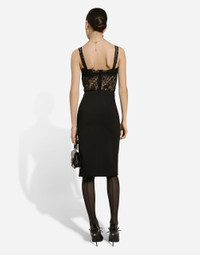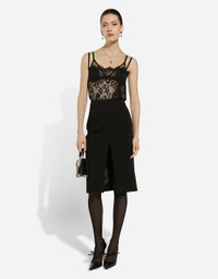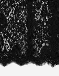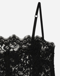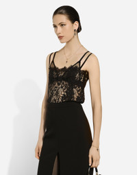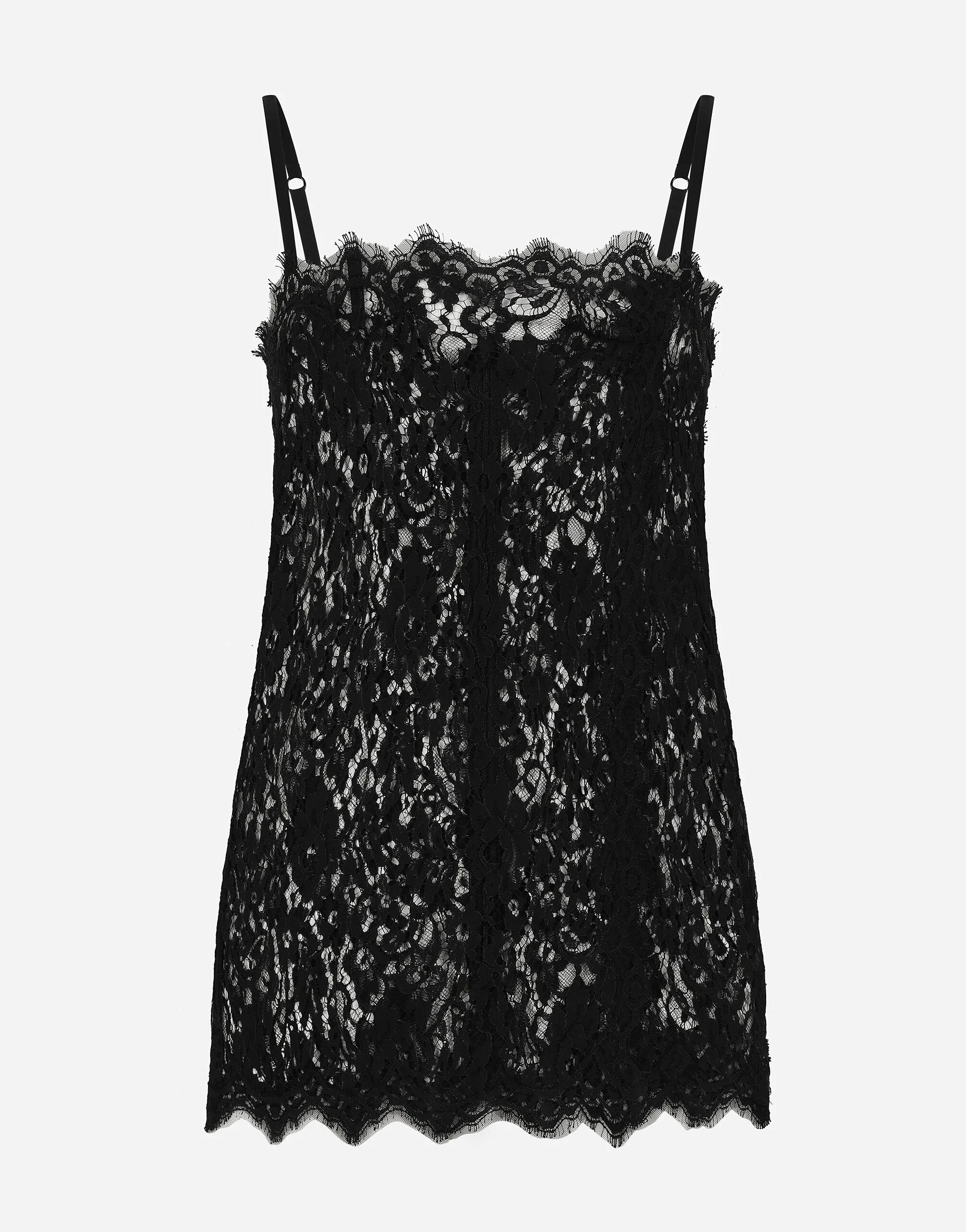 Inspired by 80s fashion photography, the Black Sicily collection masterfully blends masculine and feminine elements, pairing tailored cuts and corset details for the FW 24/25 season. A new vision of the iconic Nero Sicilia black is conveyed through contemporary and sensual looks: jackets and skirts in all-over glen plaid pair with openwork socks, while the 50s-inspired Mun shoes with Eva heel go with the houndstooth Sicily bag featuring crocodile-print leather inserts. Lace top: • Black • Straight neckline • Sleeveless with adjustable satin straps • Zipper fastening at the back • The piece measures 67 cm from the rear collar seam on a size IT 40 • The model is 175 cm tall and wears a size IT 40 • Made in Italy External composition: 90% Polyamide 7% Acetate 3% Silk
