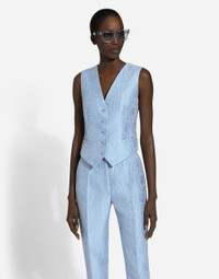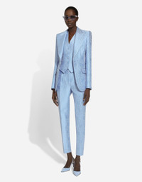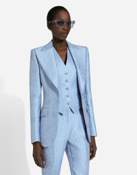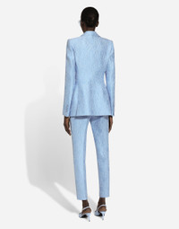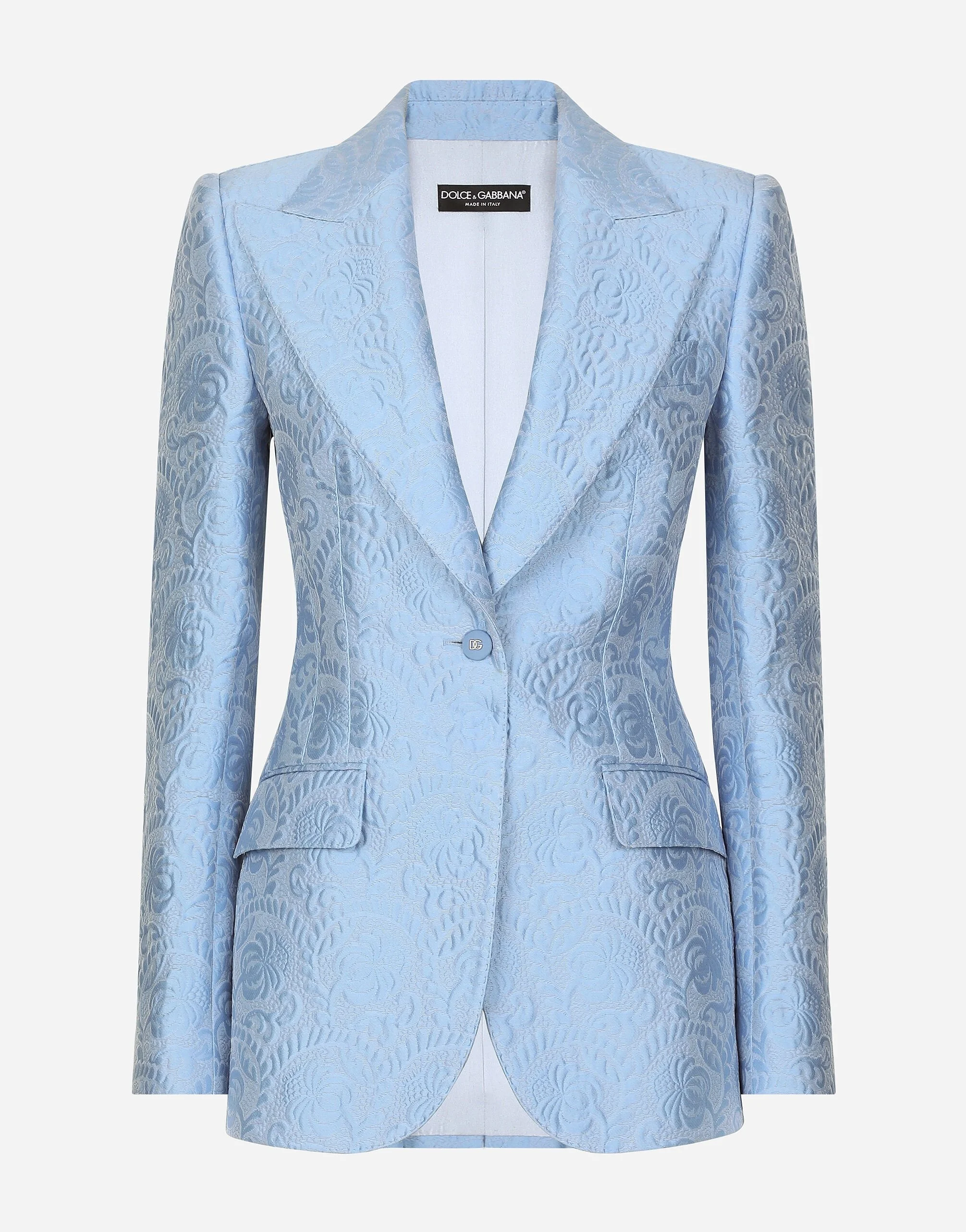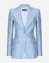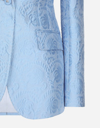 In the FW 24/25 DNA Collection, the rules of classic tailoring have been reworked with an innovative feel. New raschel weave techniques feature on micro-jackets and coats, and original textures are woven on trench coats, skirts, jacquard suits and shirts. The color palette made up of Nero Sicilia black, Milky White and Ocean Blue is also original. The iconic bags in fine nappa leather and “Pyton FC Machine” finish off the looks, as well as the Muns shoes inspired by the Global Ambassador, Mun KaYoung. Single-breasted floral quilted jacquard Turlington jacket: • Light blue • Peak lapels • Long sleeves • Flap pockets • Tonal silk satin lining • Cannete-covered button fastenings and DG logo • The piece measures 70.5 cm from the rear collar seam on a size IT 40 • The model is 175 cm tall and wears a size IT 40 • Made in Italy External composition: 64% Cotton 23% Polyester 13% Silk Internal composition: 100% Silk
